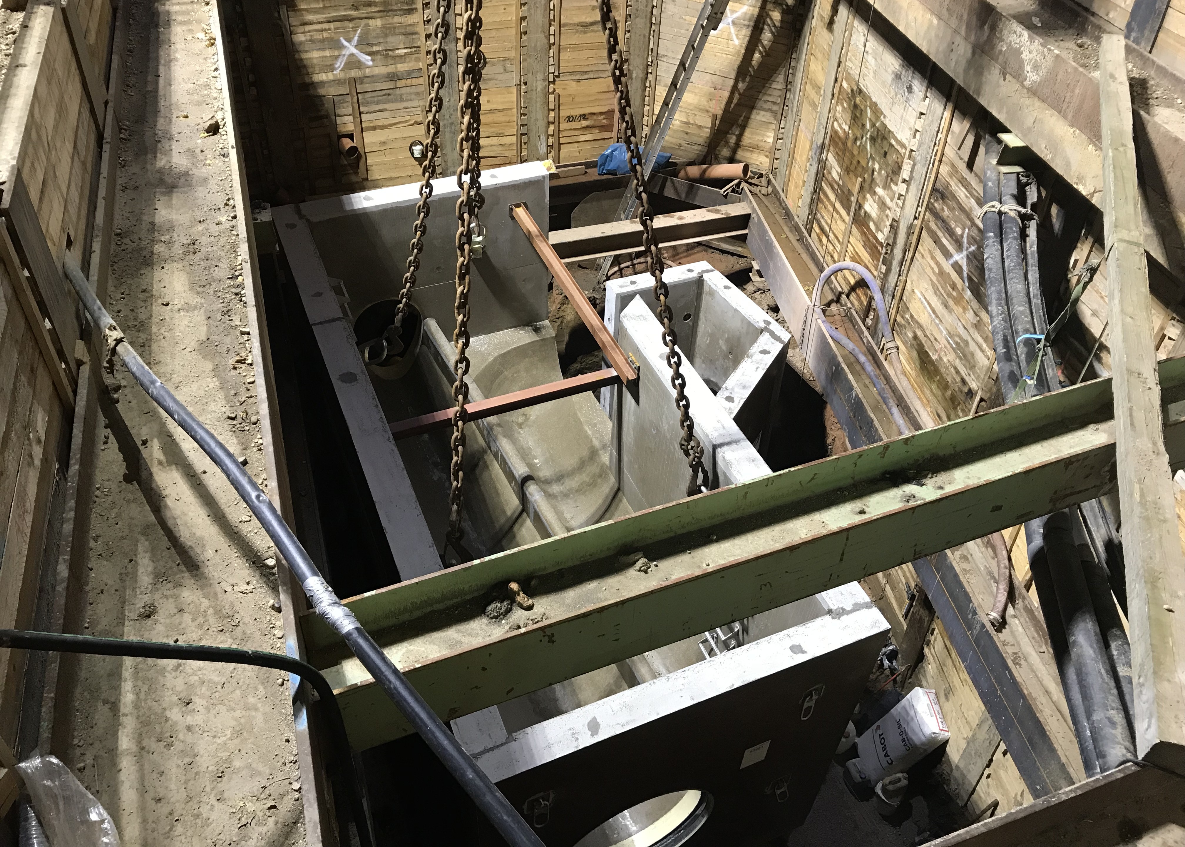 Die Besonderheiten dieser Maßnah-me waren neben dem Vortrieb die Errichtung eines Abschlagsbauwer-kes in Polymerbetonbauweise in den Abmessungen 6,50 m x 4,20 m x 8,00 m, der Abbruch des vorhandenen Bauwerkes einschließlich der erfor-derlichen Mischwasserhaltung des bestehenden Kanals Eiprofil 760/ 1140.