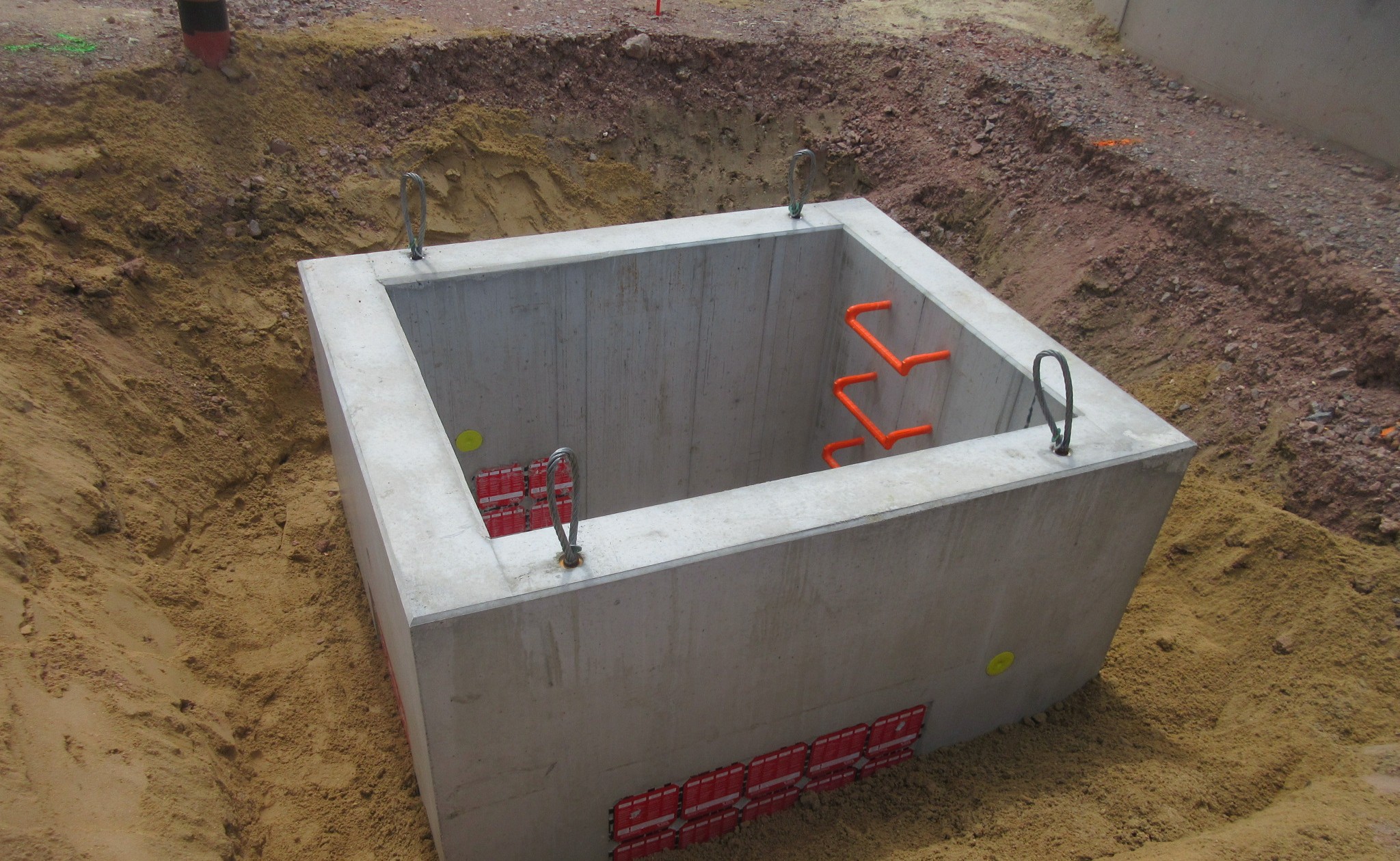 Die monolithische Erstellung des Pumpenhauses in Stahlbeton mit Ein-bauten erfolgte nach Erstellung der Baugrube. Das Pumpenhaus hat eine Fläche von 7,60 m x 6,60 m und eine Tiefe von 4,20 m. Die dazugehörige Baugrubensicherung konnte durch das Einbringen von ca. 460 m² Stahlspundwänden bis 9,00 m Länge realisiert werden.