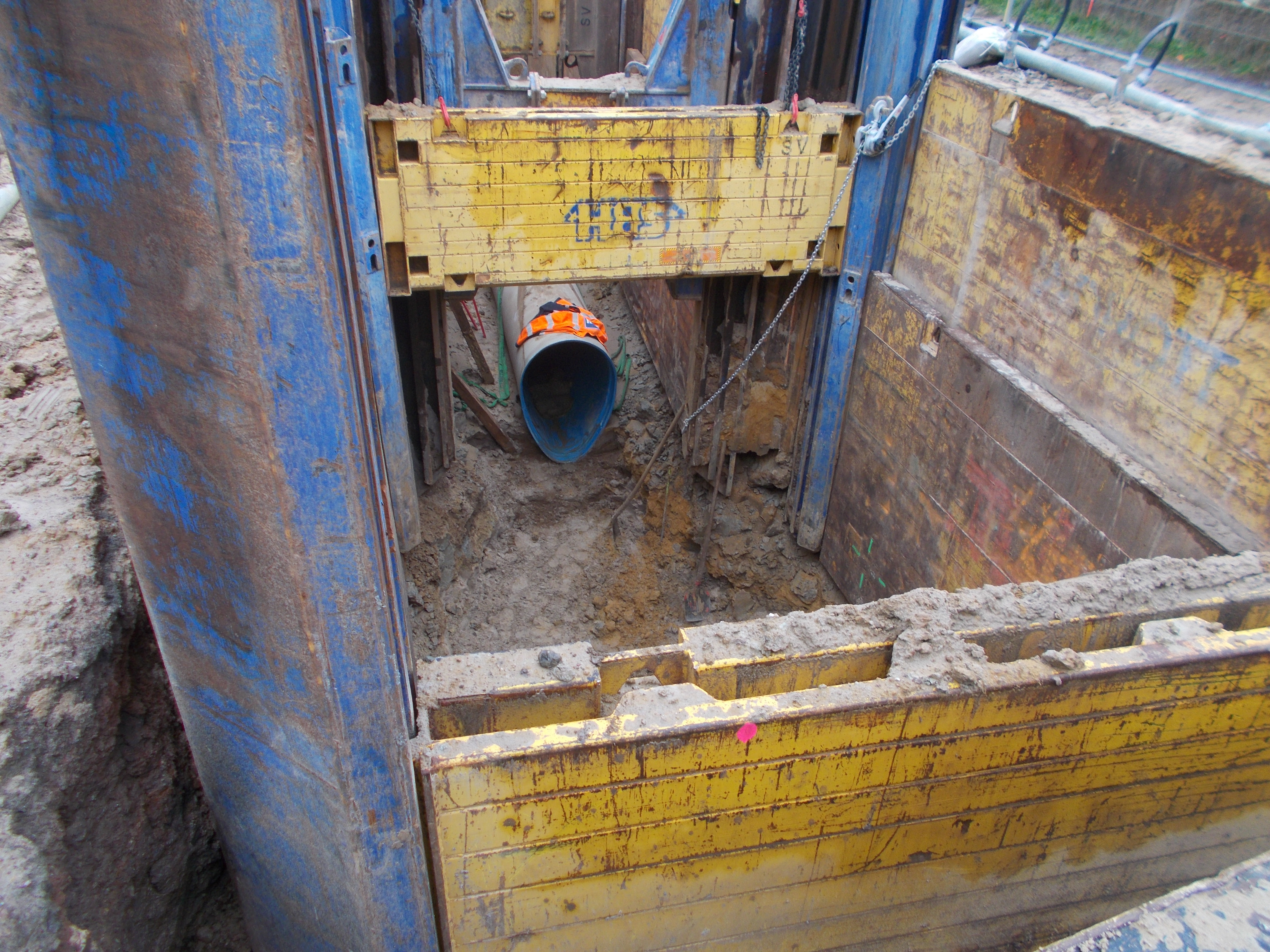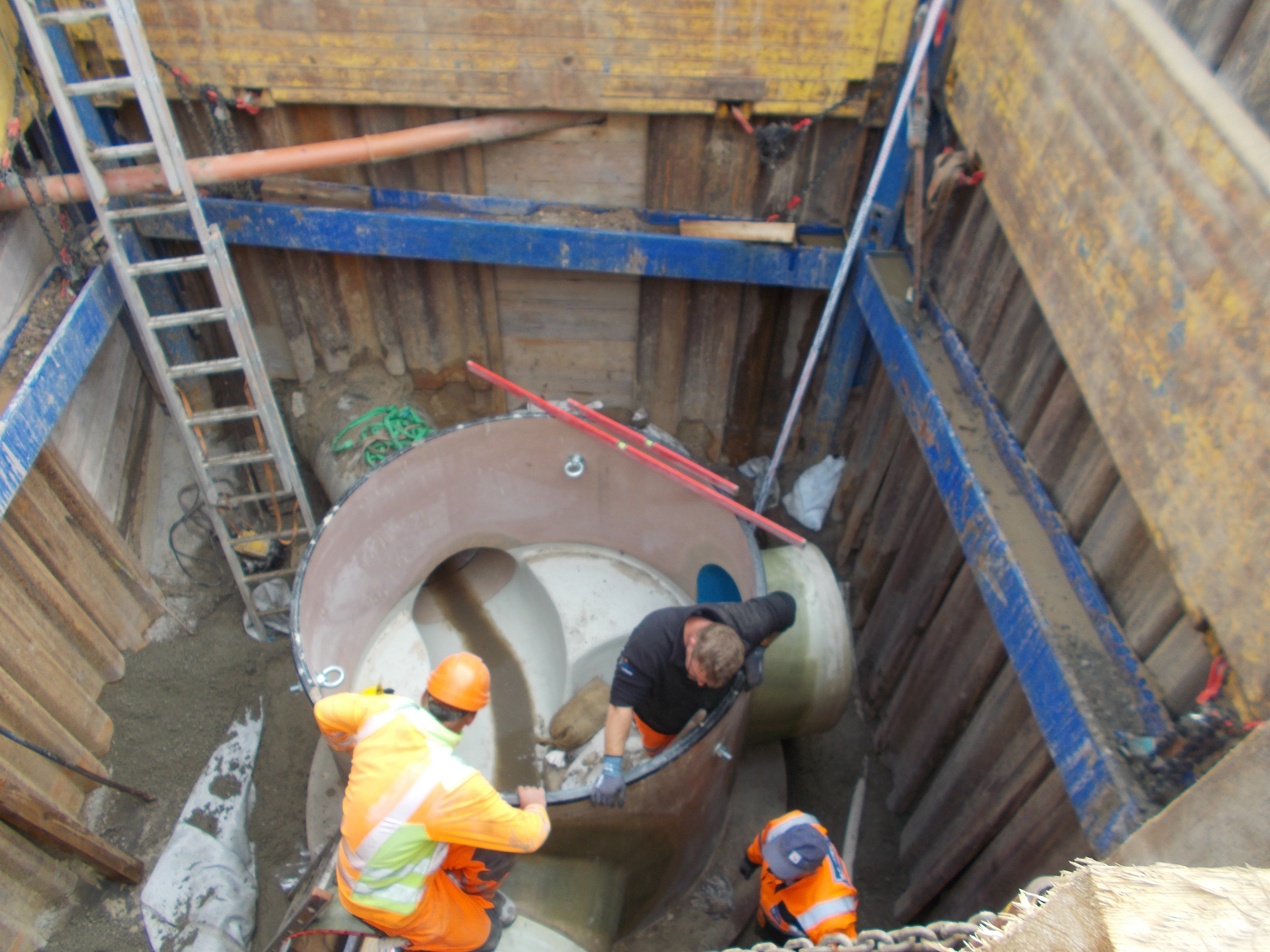 Für die Sammlung und den Transport der Abwässer wurde eine Misch-wasserkanalisation von rund 1260 m Länge in offener Bauweise geplant. Die Rohrleitungen bestehen zum einen aus PP in den Nennweiten OD 160 und OD 315 mit Schachtbauwer-ken von DN 1000 und zum anderen aus GFK in den Nennweiten DN 600, DN 500/750 sowie DN 800/1200 (Ei-Profil) mit Schächten bis DN 2000. Der Kanal umfasst dabei ein Vereini-gungsbauwerk für den Abwasserzu-fluss aus dem benachbarten Reins-dorf und stellt weiterhin die Vorflut für den südöstlichen Teil von Gollma dar, der zukünftig ebenfalls erschlos-sen werden sollen.