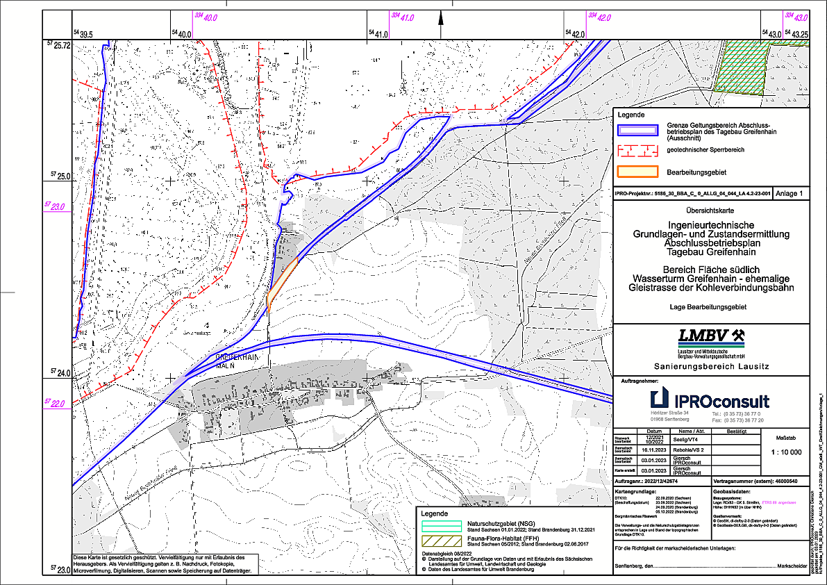 Die LMBV mbH plant den Rückbau verbliebener, ehemals bergbaulich genutzter Anlagen für eine Teilfläche der ehemaligen Kohleverbindungs-bahn im Geltungsbereich ABP Tage-bau Greifenhain. Die 0,83 Hektar große Fläche im Tagebau befindet sich im Südosten des Landes Bran-denburg, nördlich der Ortslage Grei-fenhain.