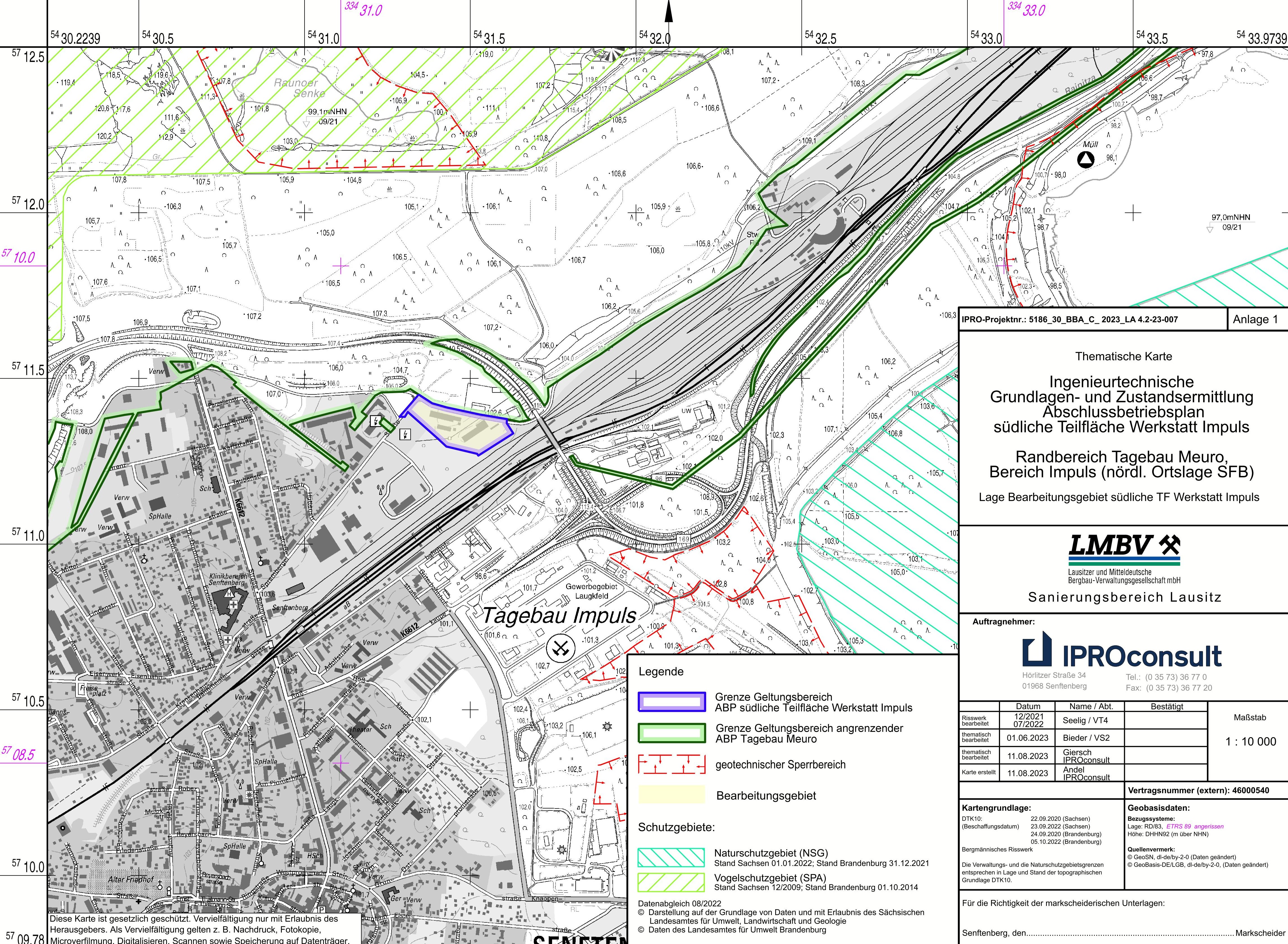 Die LMBV mbH plant den Rückbau verbliebener, ehemals bergbaulich genutzter Anlagen und die Verwah-rung/Nachverwahrung von Brunnen und Grundwassermessstellen für die Randflächen im Geltungsbereich ABP Tagebau Meuro und ABP südliche Teilfläche Werkstattkomplex Impuls. Der Tagebau Meuro, nördlich der Ortslage Senftenberg, befindet sich im Landkreis Oberspreewald-Lausitz des Landes Brandenburg. Die Flä-chengröße von 22,74 Hektar erstreckt sich über die Geltungsbereiche bei-der Abschlussbetriebspläne.