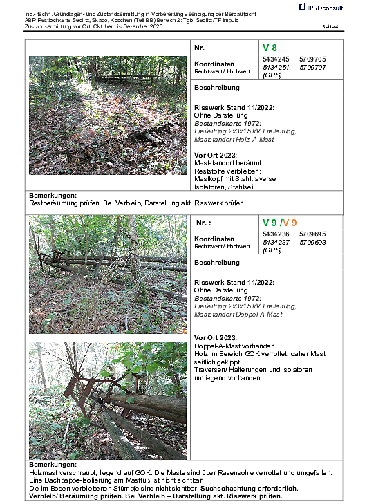 Die Grundlagen- und Zustandsermitt-lung umfasst die Erarbeitung einer Dokumentation zum Feldvergleich vor Ort, die Ermittlung noch erforder-licher Sanierungsleistungen, der Restberäumung bergbaulicher Abfälle und der Erstellung entsprechender Mengengerüste. Ein Abgleich der ak-tuellen Situation vor Ort mit dem bergmännischen Risswerk und die Ist-Zustandsbeschreibung der Flä-chen und Wege bilden die Grundlage zur weiteren Rückbau- und Beräu-mungsplanung. Des Weiteren ist ge-mäß Beauftragung der Ist-/Verwahr-ungszustand von Brunnen und Grundwassermessstellen zu recher-chieren, vor Ort zu überprüfen und in geeigneter Form zu dokumentieren.
