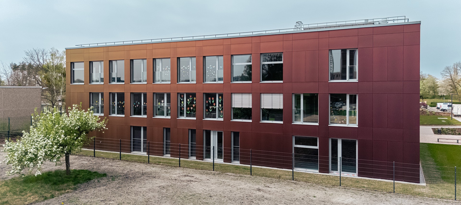 Die Fassaden wurden mit großforma-tigen Fassadentafeln in Chamäleon-Optik versehen. Damit wurde die Na-mensgebung der Schule in die Wahr-nehmung (Regenbogen) gerückt. Je nach Sonnen- und Lichtstand er-scheint die Fassade in anderen Far-ben.