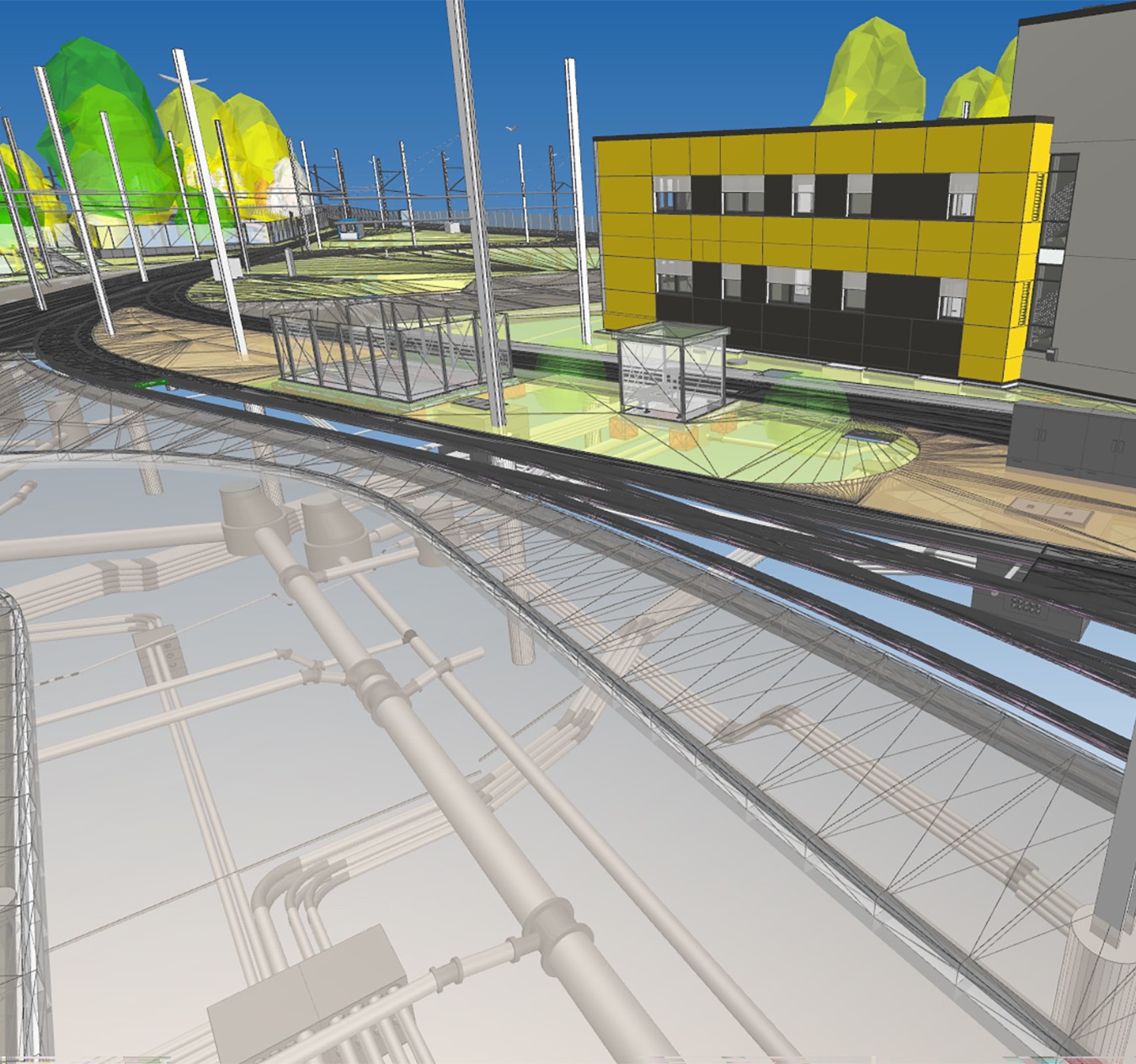 Die Planung umfasst mehrere Funk-tionsgebäude, wie Werkstatt, Einsatz-leitung, Pförtnergebäude, Nebenbe-triebsgebäude, Carport und Radprofil-messung sowie umfangreiche Ver-kehrs-, Gleis- und Freianlagen.