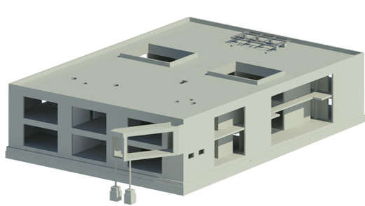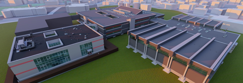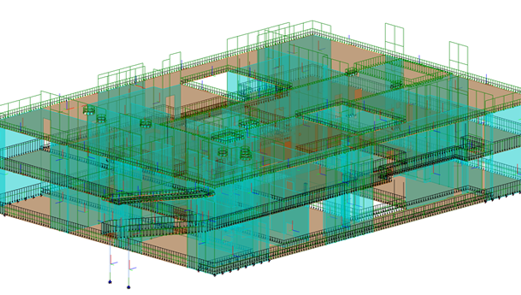 Als Grundlage der Modellierung dien-ten vorrangig analoge Pläne. Daher wurden bereits in frühen Leistungs-phasen Geodaten verwendet, um eine Planungsgrundlage im Umfeld des Gebäudes zu erhalten. Aufgrund der komplexen Gebäudestruktur und der Splitlevel-Architektur, wurden in dem Modell mehr als 100 Bezugs-ebene erstellt, welche als Referenz für die Modellelemente dienen.