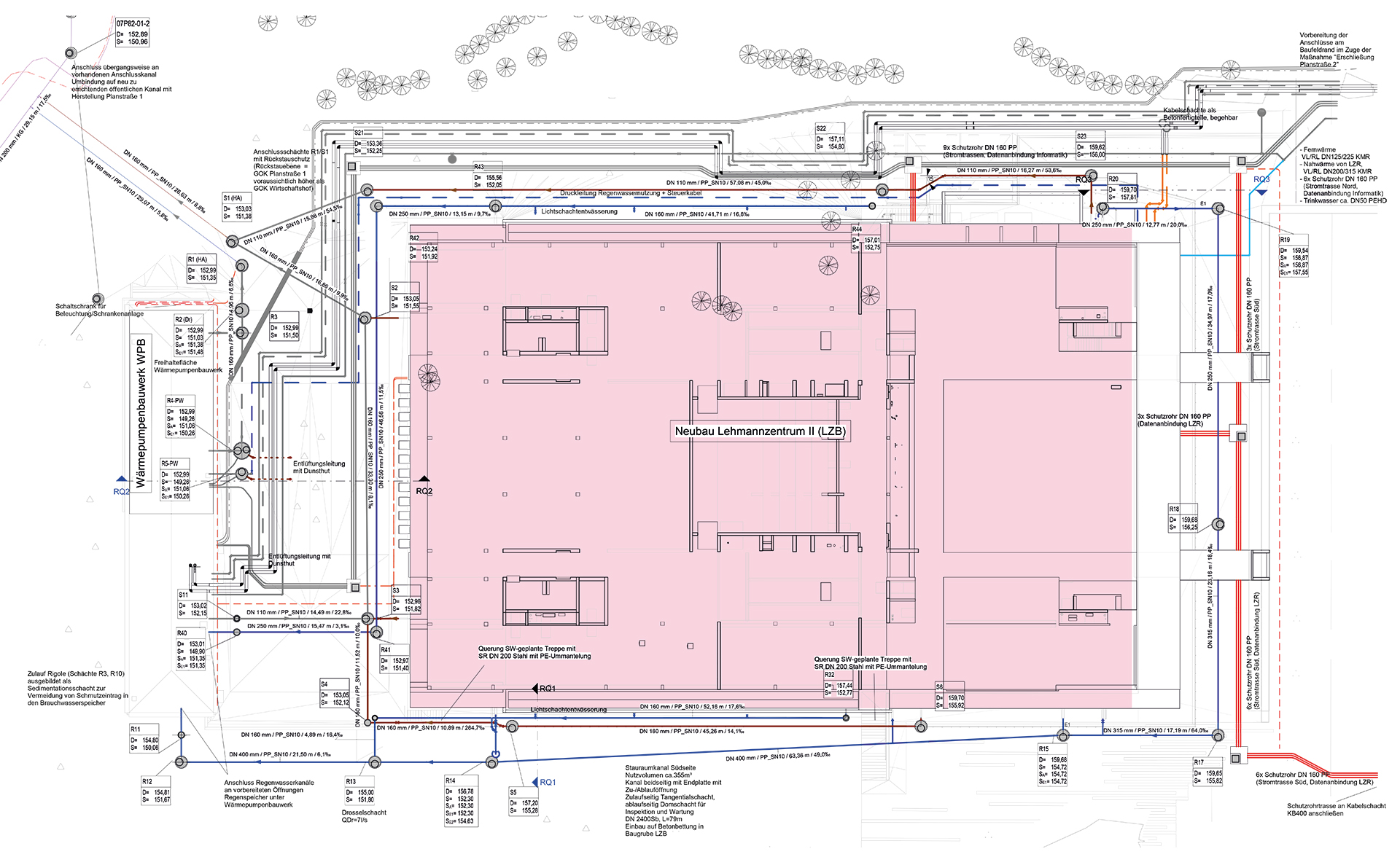In unmittelbarer Nähe zum Lehmann-zentrum II entsteht ein Wärmepum-penbauwerk zur Abgabe von über-schüssiger Wärme an das Fern-wärmenetz der Sachsenenergie, mit den zugehörigen Nah- und Fern-wärmeleitungen.