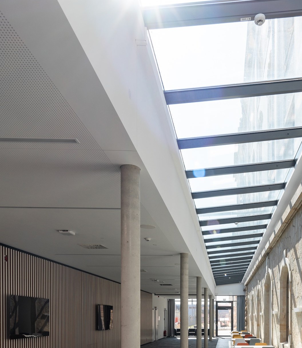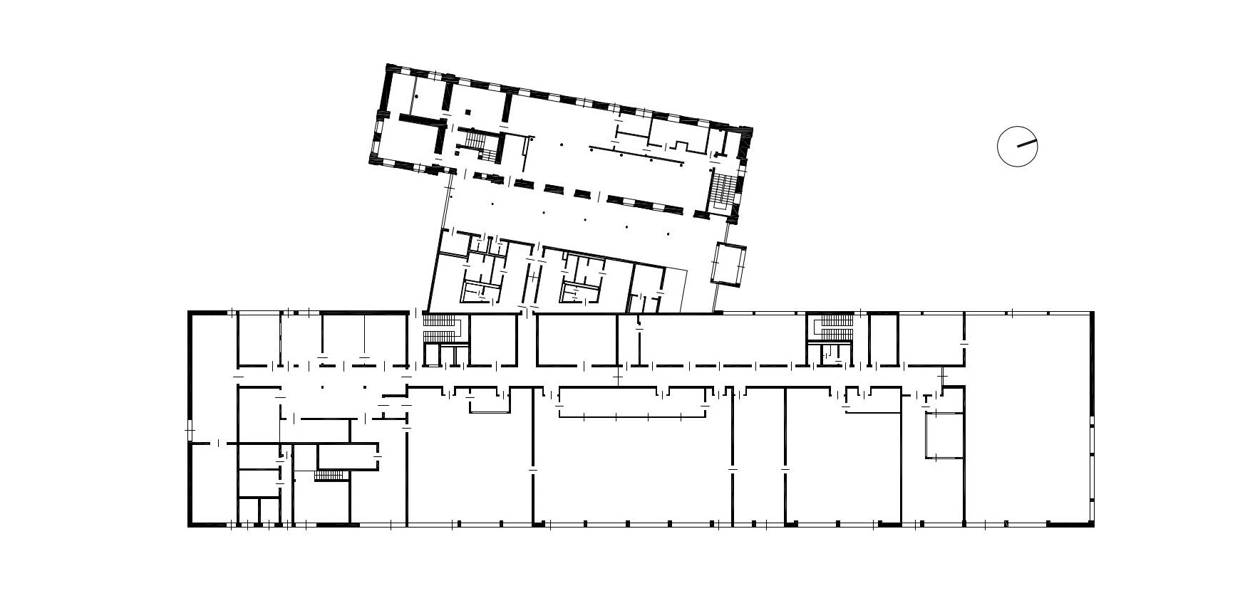 raum und Nebenräume. Zu dem be-stehenden Treppenhaus erhielt der Altbau ein zweites Treppenhaus sowie einen Aufzug. Im ersten bis dritten Obergeschoss befinden sich vorwie-gend Büroräume, ergänzt durch Be-sprechungs- und Nebenräume wie WC-Anlagen, Teeküchen, Serverraum. Ein eingeschossiger gläserner Ge-bäudeteil verbindet das Technikum und den Altbau. Dieser dient als