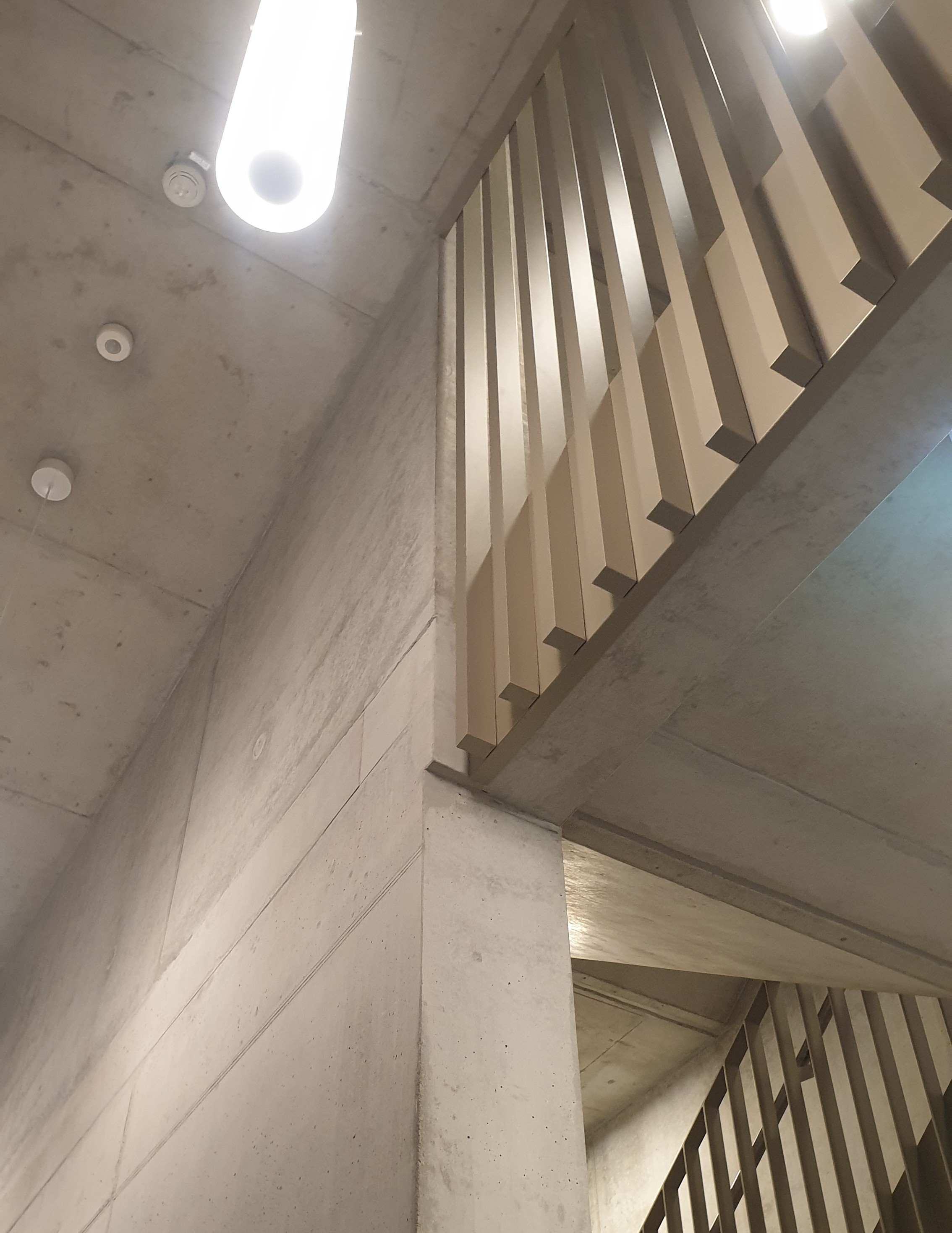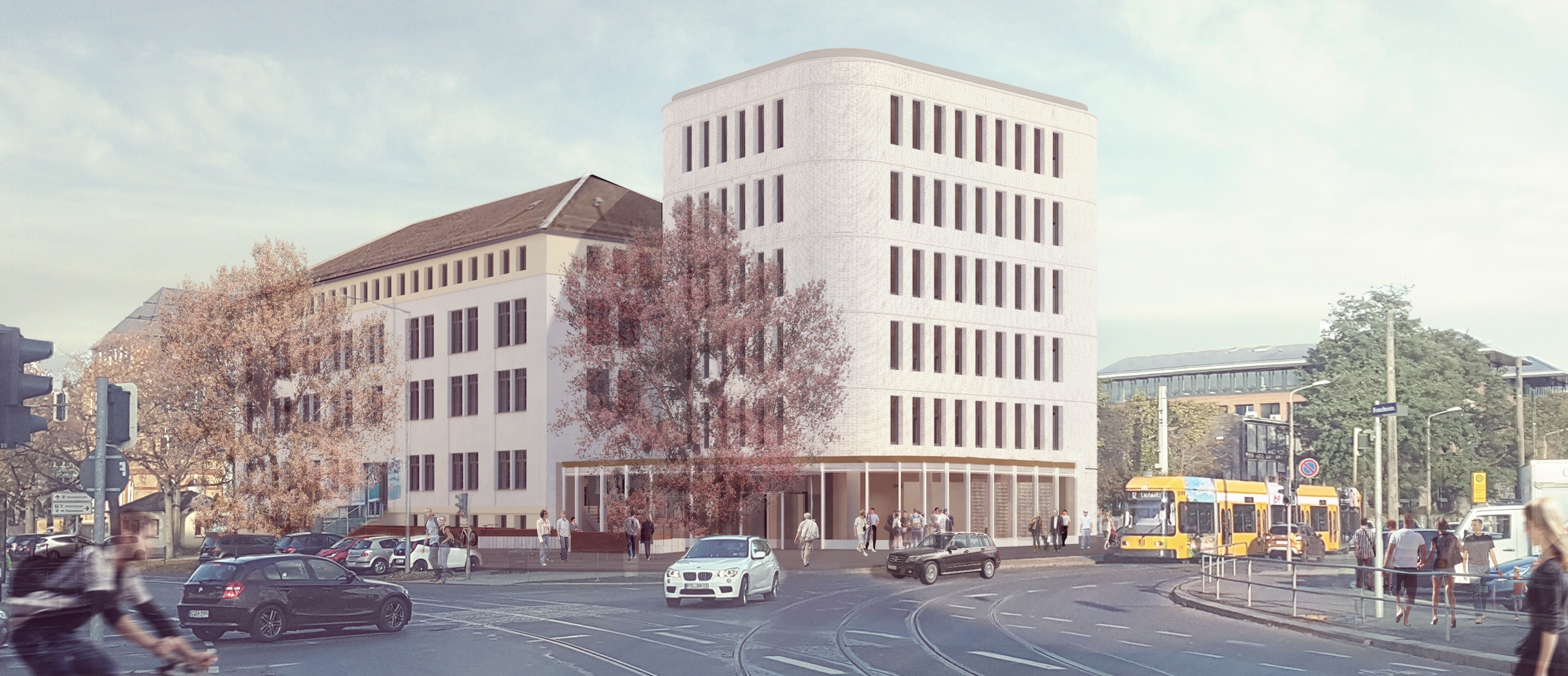 Es entstand ein sechsgeschossiges Gebäude mit Keller, das mit seinem spannungsvollen Grundriss und seiner außergewöhnlichen Fassade einen Akzent setzt.