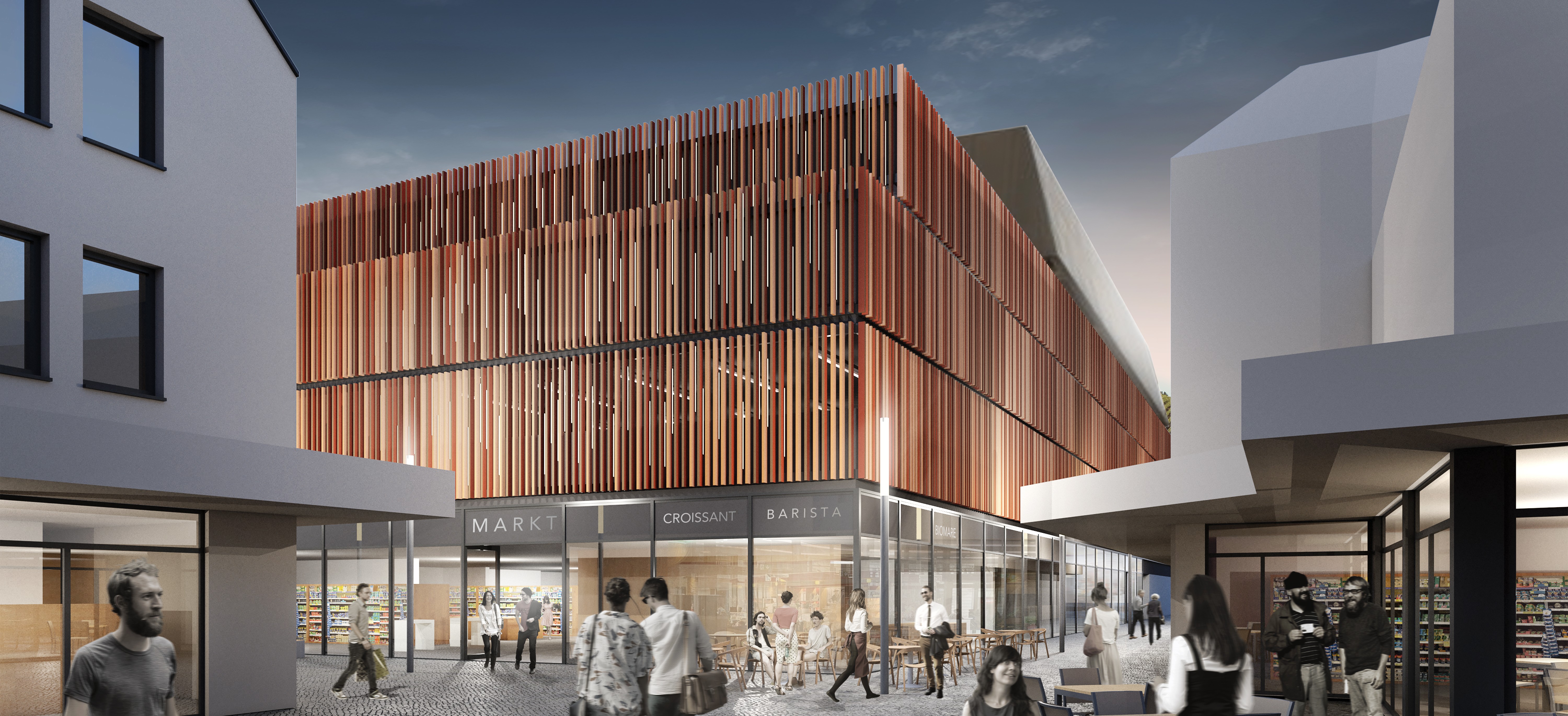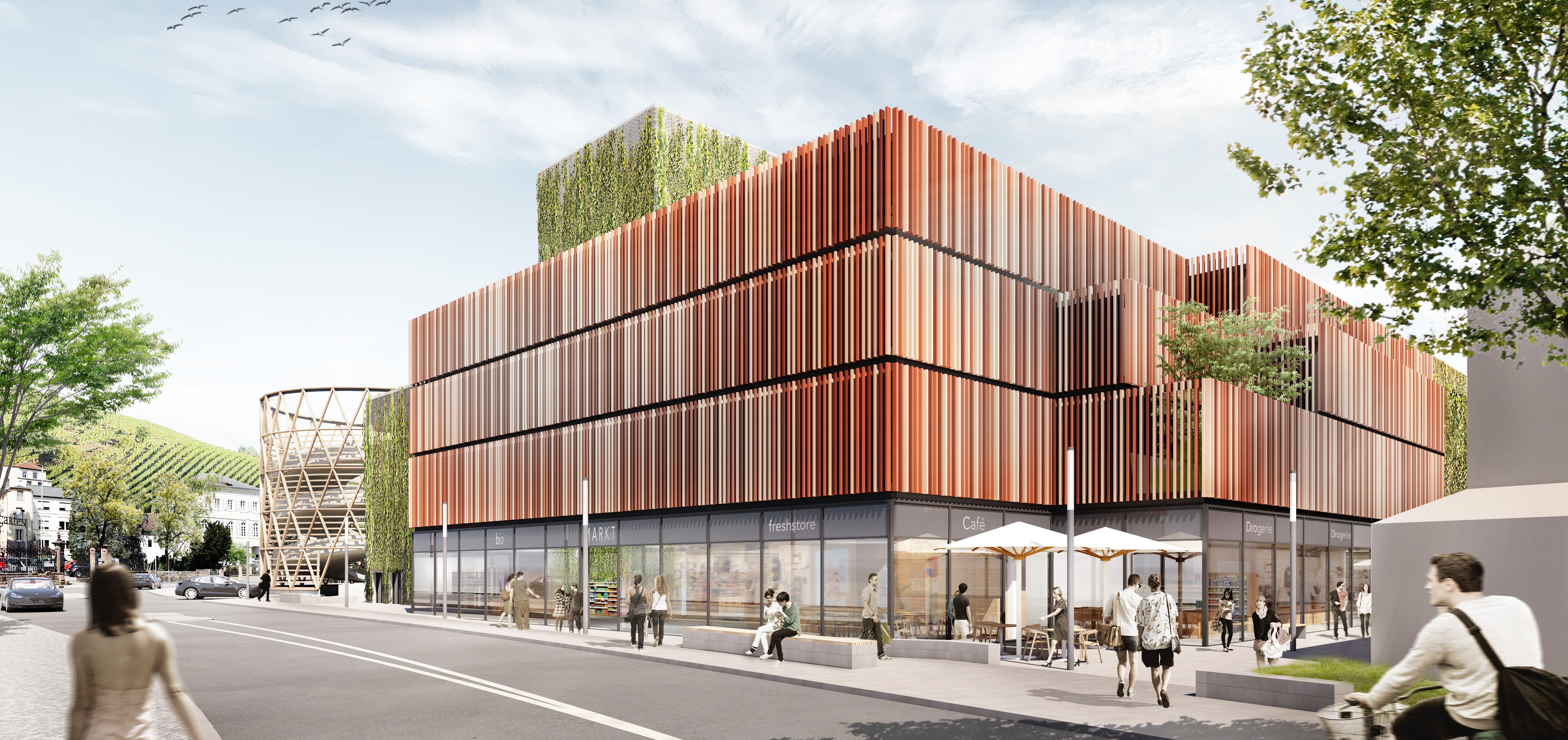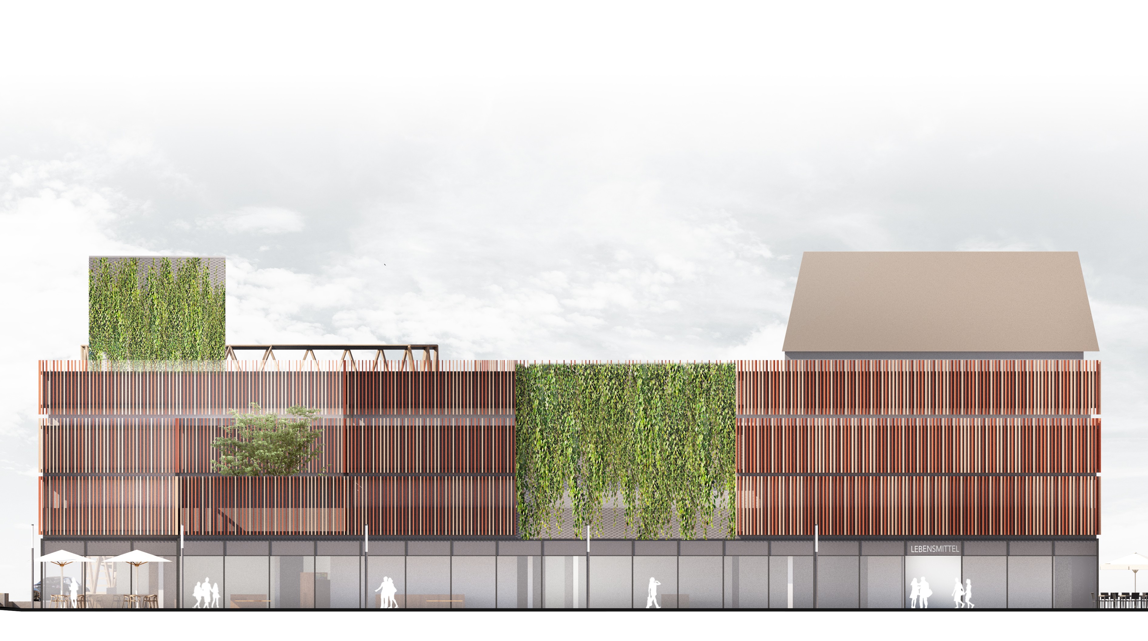 Hertie-Warenhaus auf. Es entstand ein Entwurf mit Lamellen in Rottönen an einer Fassade mit Vor- und Rück-sprüngen. Die Lamellen erinnern an die typischen Pfähle der Weinberge. Verstärkt wird diese regionale Ver-wurzelung durch Fassadengrün sowie eine Gitterstruktur an der Parkhaus-wendel, die an Fachwerke der Alt-stadt erinnert.