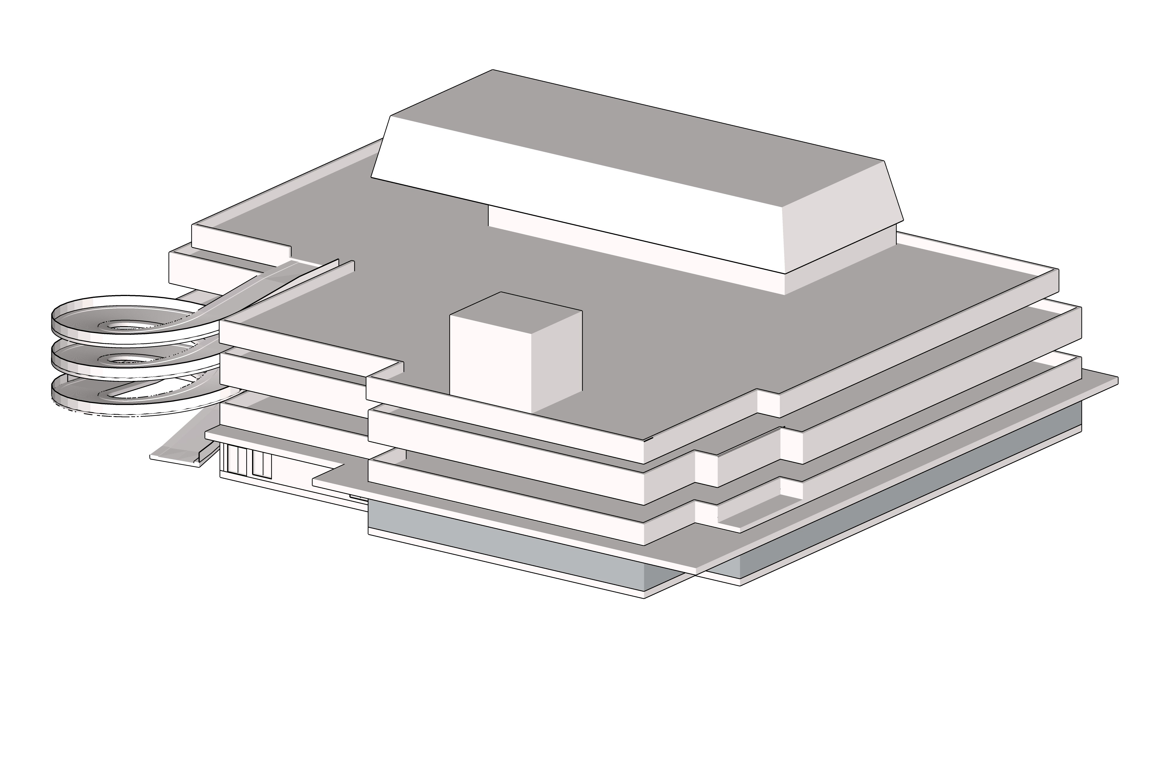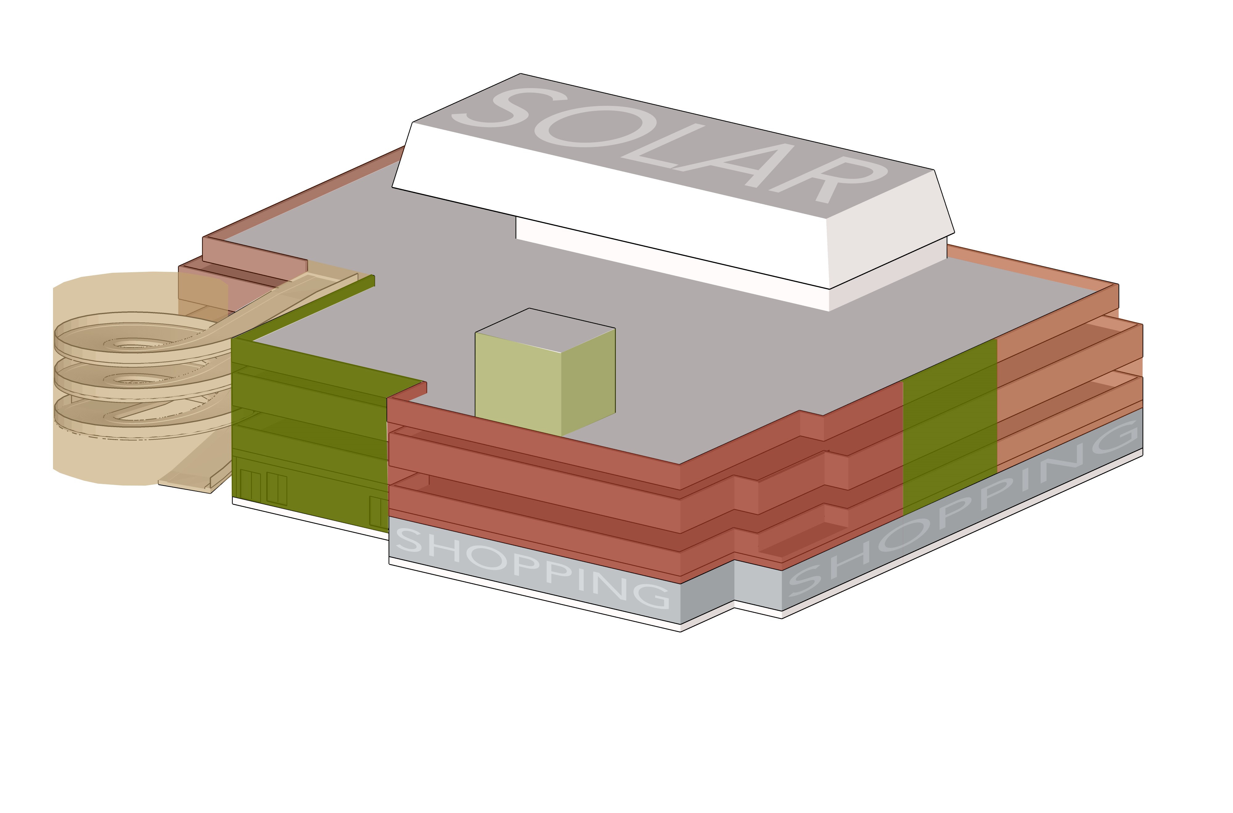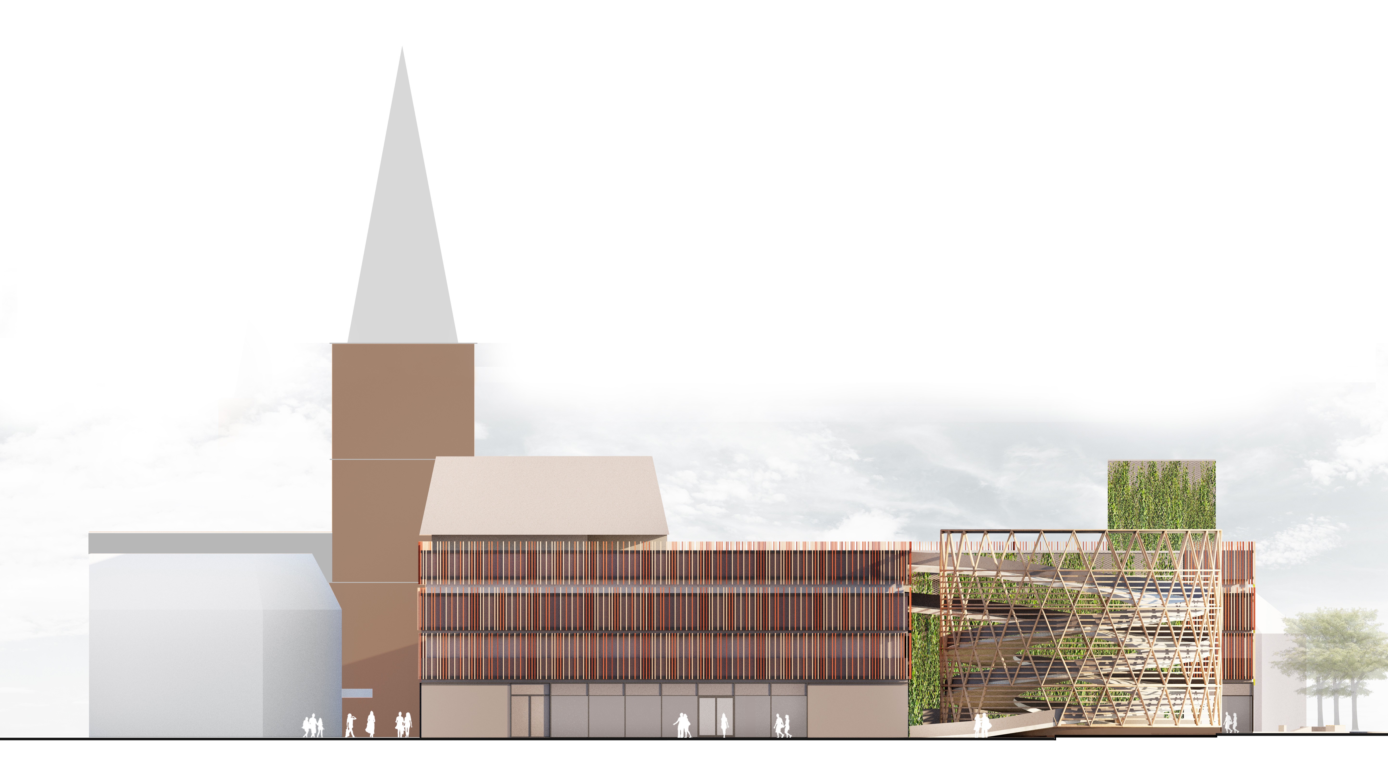 Hertie-Warenhaus auf. Es entstand ein Entwurf mit Lamellen in Rottönen an einer Fassade mit Vor- und Rück-sprüngen. Die Lamellen erinnern an die typischen Pfähle der Weinberge. Verstärkt wird diese regionale Ver-wurzelung durch Fassadengrün sowie eine Gitterstruktur an der Parkhaus-wendel, die an Fachwerke der Alt-stadt erinnert.