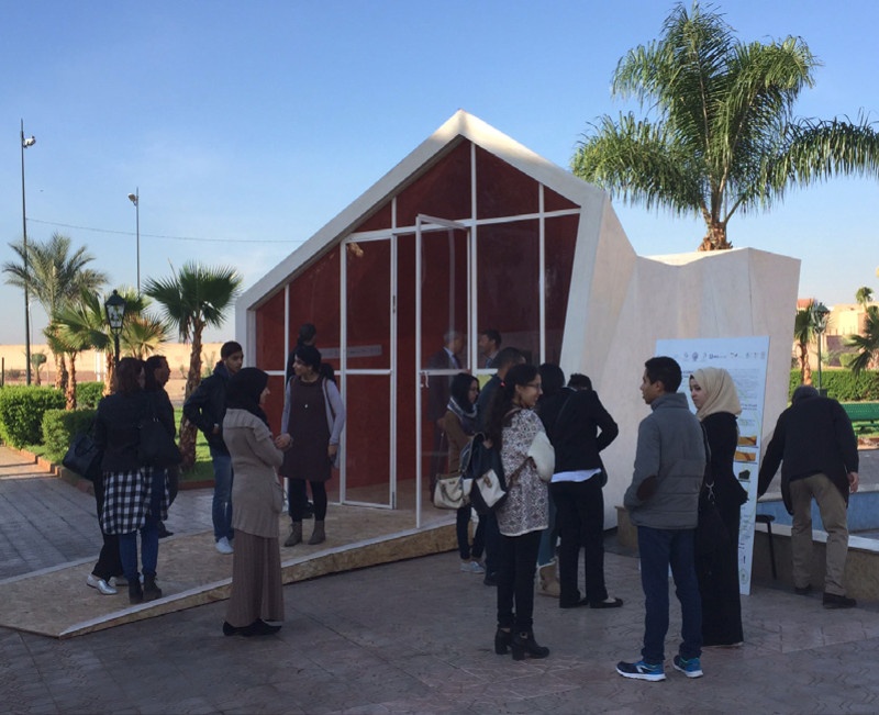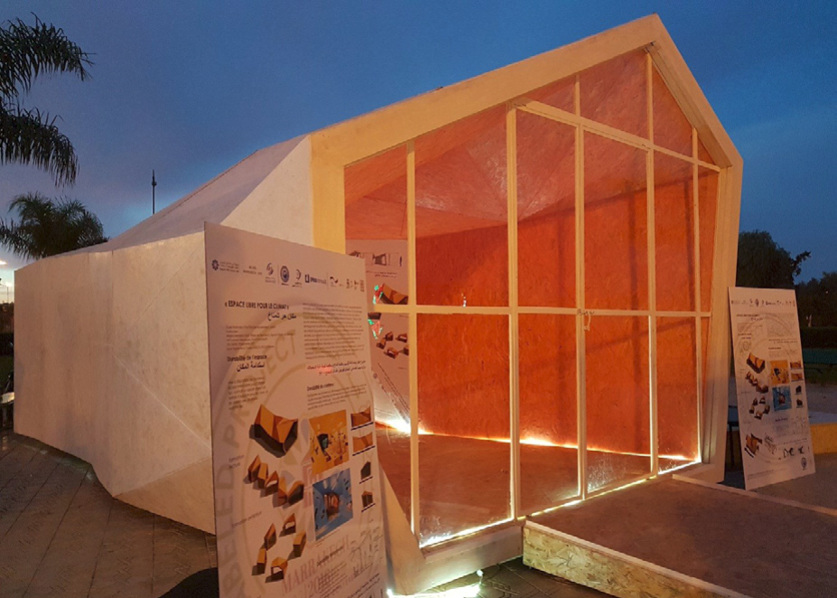 IPROconsult a donc conçu un "open space pour le climat" modulaire, multi-fonctionnel et itinérant, construit par Carlo Bancolini (HORMÊ) en collabor-ation avec l’ENAM, et présenté selon un programme spécifique dans plu-sieurs endroits sélectionnés à Mar-rakech pendant la COP22.