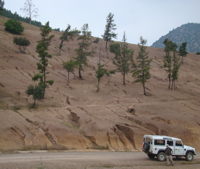 Im Kontext der zunehmenden Ver-schärfung der klimatischen Verhält-nisse in Marokko wird die drastische Zunahme langer Hitze- und Trocken-zeiten sowie gleichzeitig intensiver Starkniederschlagsereignisse prog-nostiziert. In direkter Folge steigt die Erosionsgefährdung weiterer Gebiete in Marokko stark an.