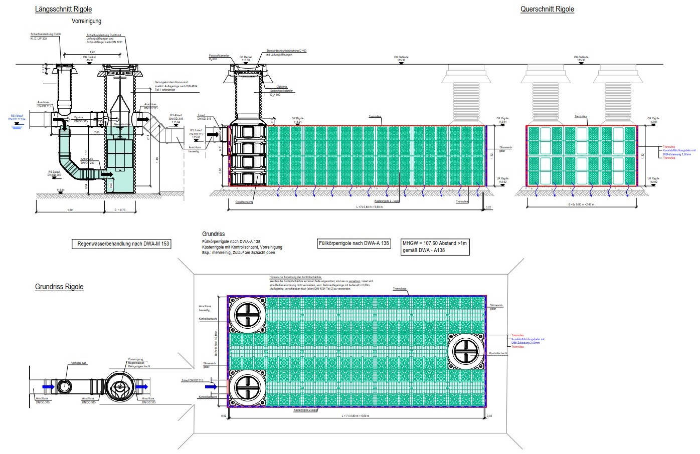 Für Versickerungsanlagen aller Art sind die Vorgaben der Wasserbehör-de zu beachten, da sich das Plange-biet in der Trinkwasserschutzzone 3a befindet. Hierzu zählt insbesondere die Vorreinigung des anfallenden Re-genwassers über die belebte Boden-zone bzw. eine technisch vergleich-bare Vorreinigung. Die Dimensionie-rung der Versickerungsanlagen, drei Mulden und eine Rigole, ist Bestand-teil der Entwurfsplanung und Grund-lage für die Beantragung des Wasser-rechtes.