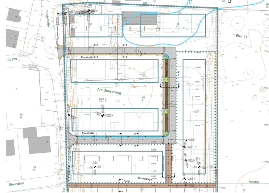 Die Erschließungsstraße beginnt in Höhe der Einmündung der Berliner Straße in die Kirchstraße und mündet ca. 60 m südlich wieder in die Kirch-straße ein. Ausgehend vom südlichen Schenkel verbindet ein 4,50 m breiter Weg die Erschließungsstraße mit dem Auweg. Das Gebiet befindet sich für den Fall des 100-jährigen Hochwas-serereignisses im Überschwem-mungsbereich des Rheins. Das hat zur Folge, dass der vorhandene Re-tentionsraum durch den Neubau des Gebietes nicht verringert werden darf. Eine Hochwassersimulation er-gab die dazu notwendigen Gelände-höhen.