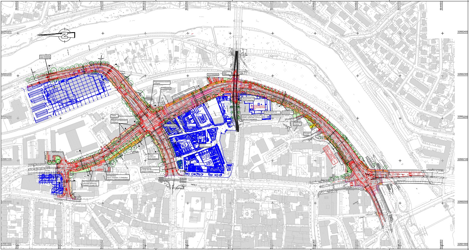 Im Zuge der Untersuchungen zur Streckenplanung zeigte sich, dass es keine einheitlich durchgehenden Aus-bauvarianten gibt. Insgesamt wurden in sechs Bereichen verschiedene Lösungsansätze untersucht und in alternativen Varianten dargestellt und abgewogen. Einige der Varianten wurden durch veränderte Randbe-dingungen oder Entscheidungen der Verwaltung bereits frühzeitig wieder aus der Variantenbetrachtung ausge-schlossen. Die nach der Abwägung als Vorzugsvariante definierte Lösung wurde durch den Stadtentwicklungs- und Umweltausschuss mit Bestäti-gung der Vorplanung festgelegt. Der Entwurf wurde durch den Stadtent-wicklungs- und Umweltausschuss für die Einreichung zur Planfeststellung bestätigt.
