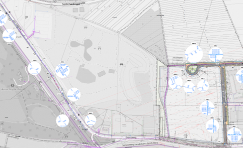 Die Erschließungsachse wird nach Osten verlagert. Die Grünflächen und Gewerbeflächen werden neu ange-ordnet. So ist zukünftig eine flexiblere Anordnung bzw. Aufteilung der Grundstücke möglich.