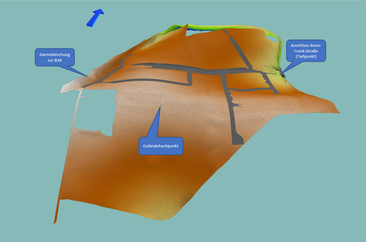 Die geplanten Straßenquerschnitte er-folgen in Breiten von 5,5 m bzw. 6,5 m (Anliegerstraße) und 15,5 m für die Anbindung des Gebietes an die Anne-Frank-Straße mit einseitigen Parkplät-zen, und. zweiseitigem Gehweg. Die Gestaltung der Anliegerstraßen soll dem einer Mischverkehrsfläche gleichkommen, um den Charakter einer Wohnstraße zu verdeutlichen.