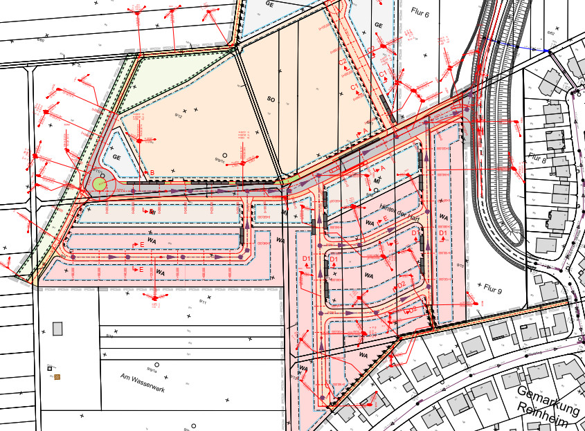 Das Baugebiet wird so konzipiert, dass ein Sondergebiet, Mischgebiete und ein allgemeines Wohngebiet ent-stehen. Der 6,8 ha große Geltungsbe-reich liegt am nordwestlichen Sied-lungsrand der Stadt Reinheim und südlich der Engelbert-Wörz-Straße sowie zwischen der Anne-Frank-Straße im Osten und der Bundes-straße B 38 im Westen.