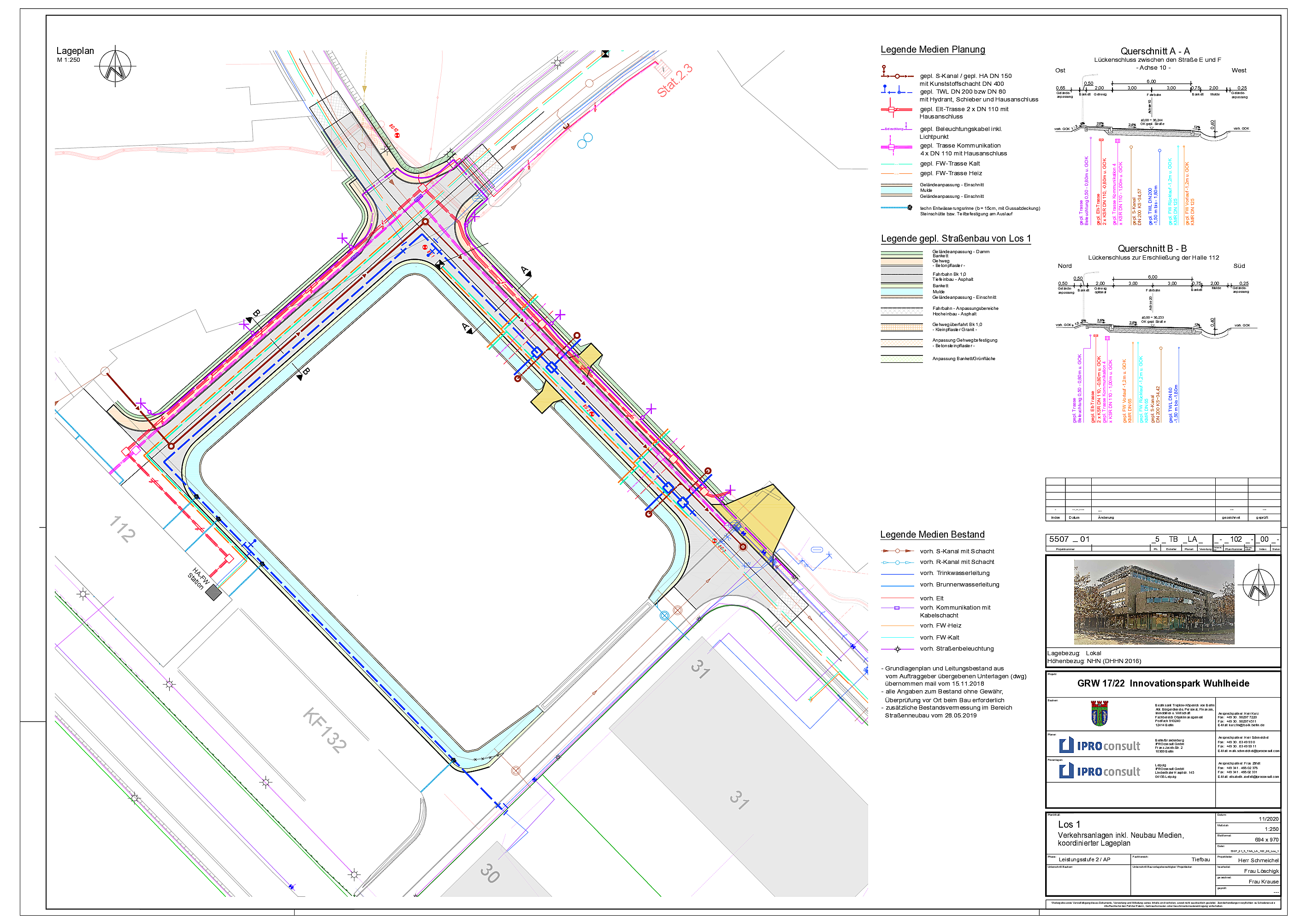 - die Neuverlegung (als Lücken-schluss) von Medien in der neu zu errichtenden Straße / in den neuen Verkehrsanlagen, auch zur Versorgung des Gebäudes 112