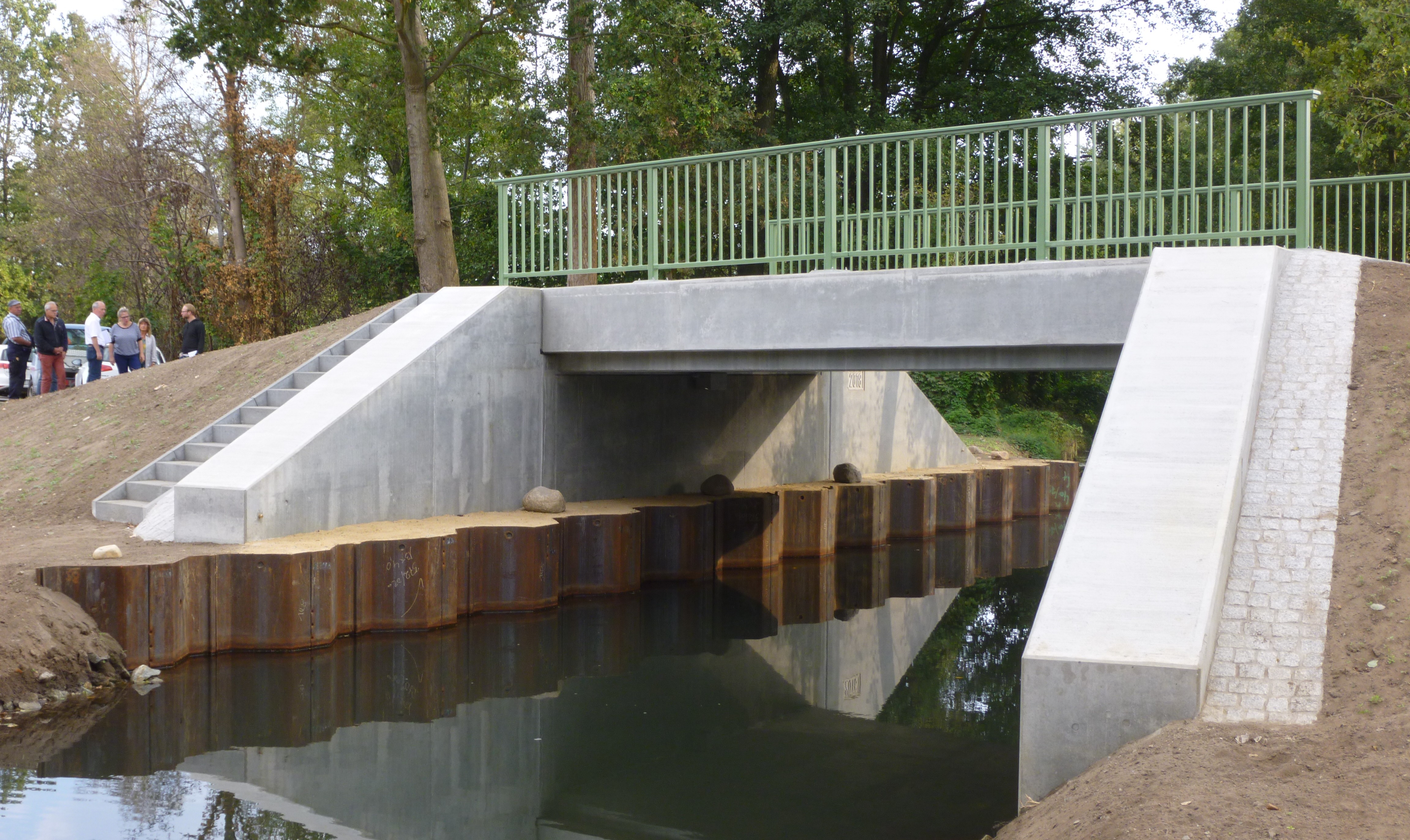 Verlandung unterhalb der Brücke war ebenfalls durch den Otter genutzt. Die jetzt vorhandene Straße ist mit einem Asphaltbelag versehen. Das Brückenbauwerk ist standortgleich als Stahlbetonbrücke in Ortbetonbauwei-se mit Spundwandgründung errich-tet. Das vorherige Bauwerk wurde ab-gerissen. Bauzeitlich wurden zwei Fangedämmen und zwei Stahlrohre zur Wasserdurchleitung errichtet. Ein Fangedamm wurde als bauzeitliche Umfahrung genutzt.