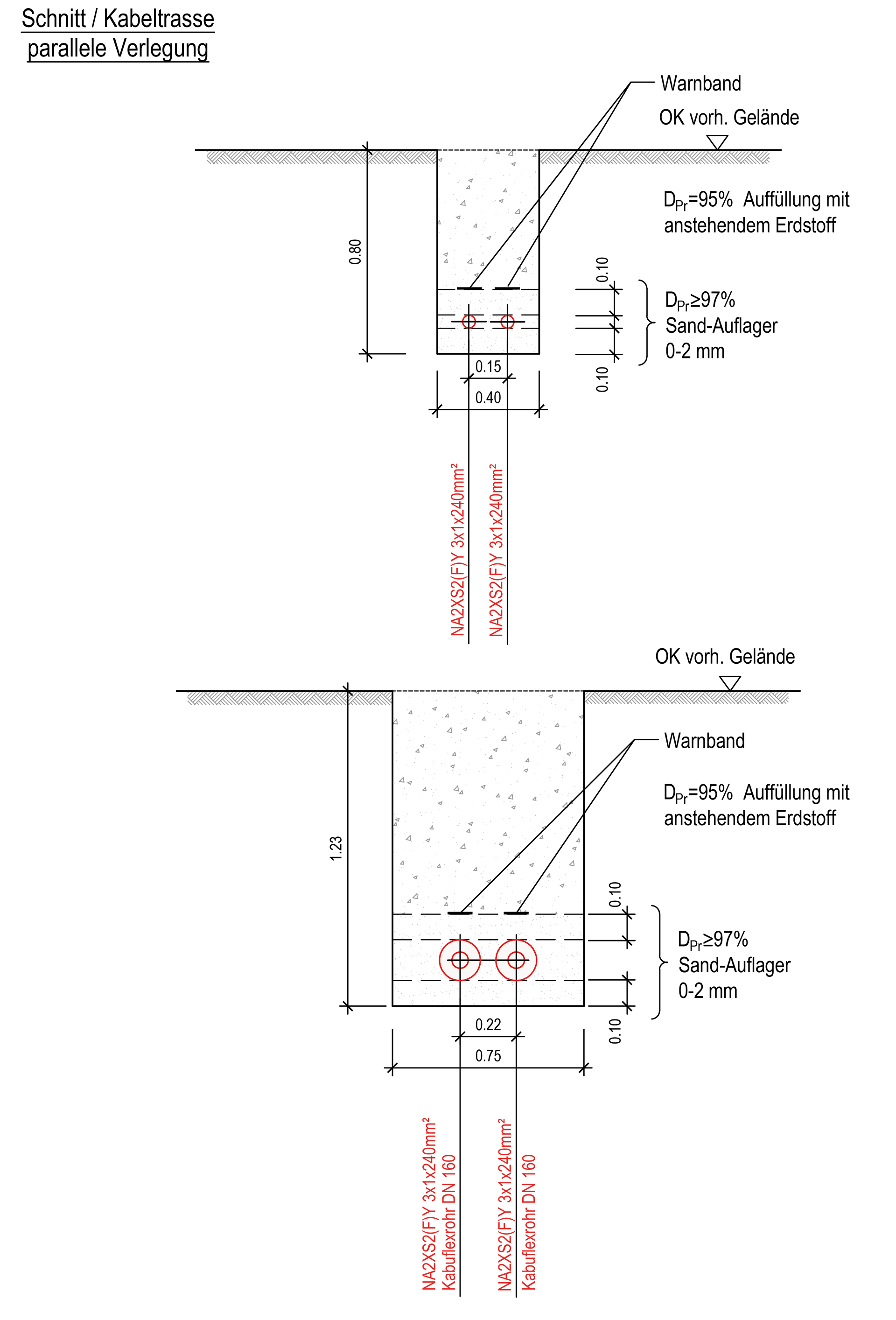Der Kabelgraben hat in der Regel eine Tiefe von 0,80 m und eine Breite von 0,40 m. An Kreuzungen von Straßen werden die Kabel in Schutzrohren Kabuflex DN 160 verlegt. Hier ist der Kabelgraben 1,20 m tief und 0,60 m breit. Bei Straßenquerungen in ge-schlossener Bauweise sind Schutz-rohre PEHD d180x16,4 einzubauen.