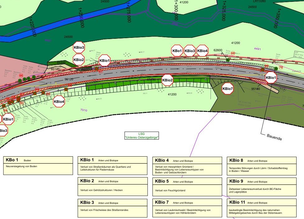Im Untersuchungsraum befindet sich der Lebensraumtyp LRT3260 – Fließ-gewässer mit Unterwasservegetation. Innerhalb des Berachtungsgebietes liegen zudem Habitatflächen des Fischotters, des Großen Mausohrs, der Kleinen Hufeisennase, der Mops-fledermaus und der Spanischen Flag-ge. Die potenziellen und tatsächlichen Beeinträchtigungen für Lebensräume des FFH-Gebietes bezüglich des LRT3260 Fließgewässer mit Unter-wasservegetation wie auch der Tier-arten des Anhangs II der FFH-RL wurden in ihrer Erheblichkeit einge-schätzt. Zudem wurden mögliche ku-mulative Wirkungen, welche sich aus dem Zusammenwirken des Straßen-bauvorhabens mit weiteren im Unter-suchungsraum vorgesehenen Pla-nungen und Projekten ergeben kön-nen, beurteilt.