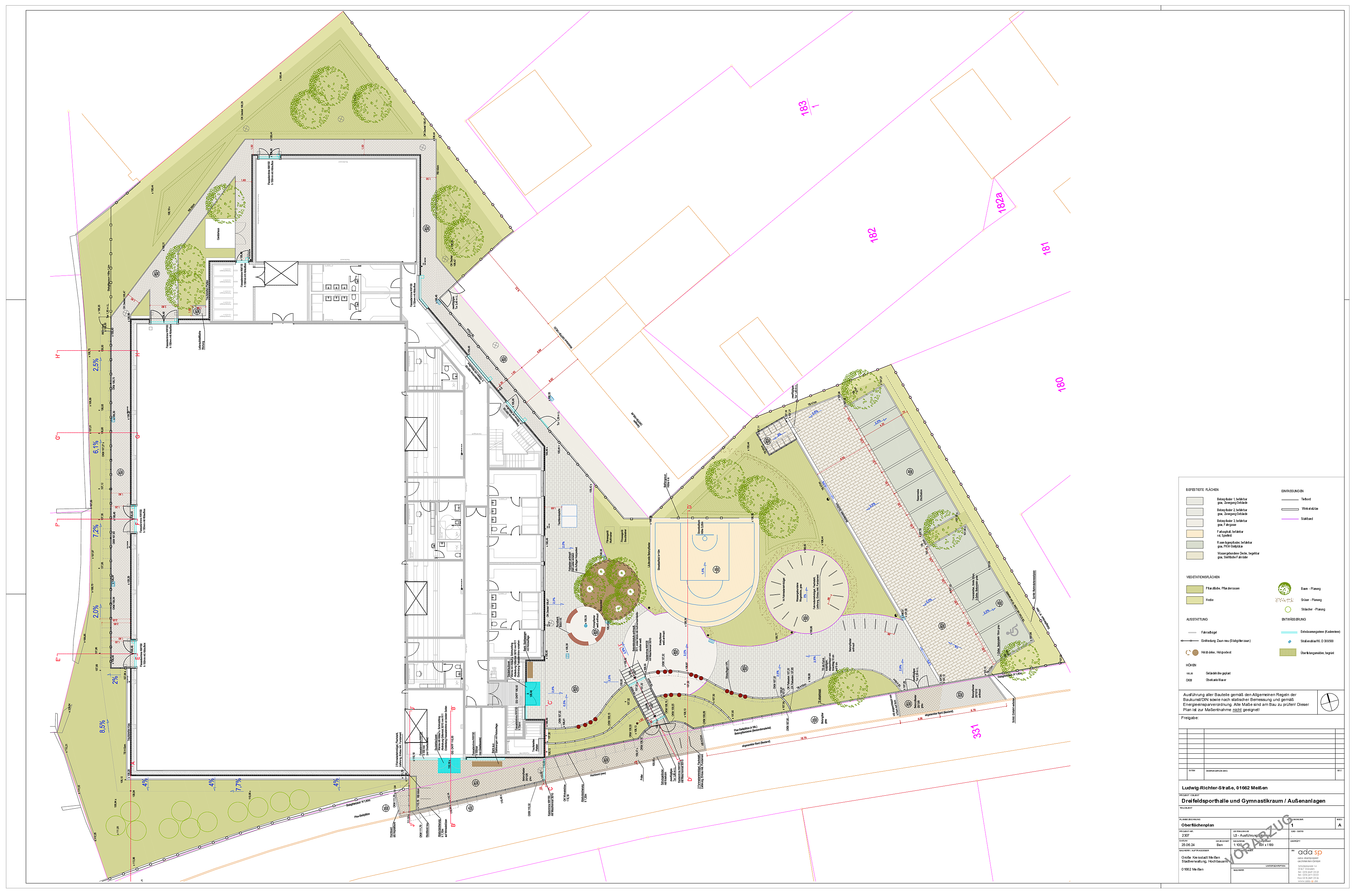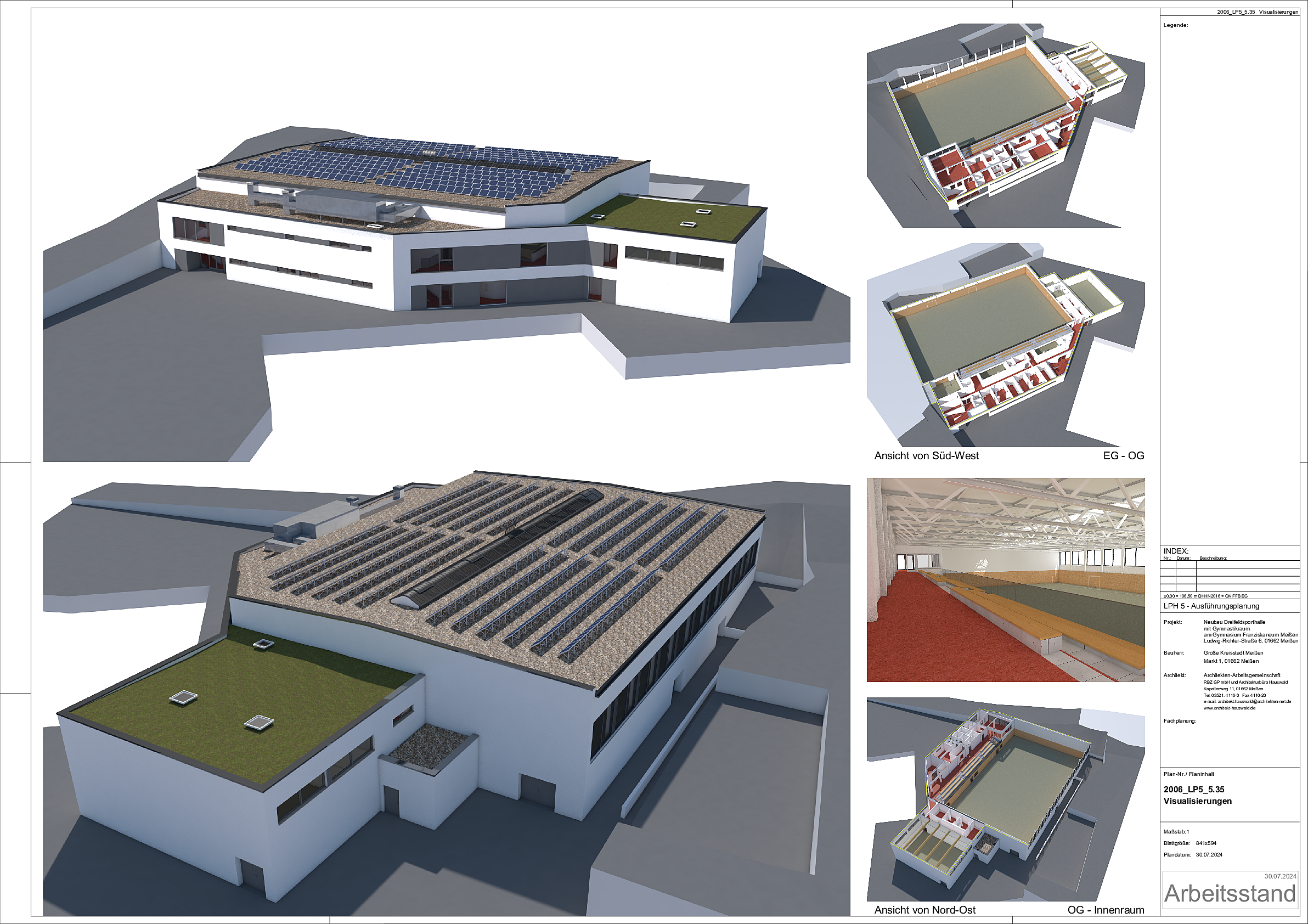 Benötigt und geplant wird eine Drei-Feld-Sporthalle als Schulsporthalle, ergänzt um eine Gymnastikhalle, 150 Zuschauerplätze auf einer Tribüne so-wie ein etwas großzügigeres Foyer mit Catering-Möglichkeit.