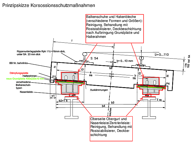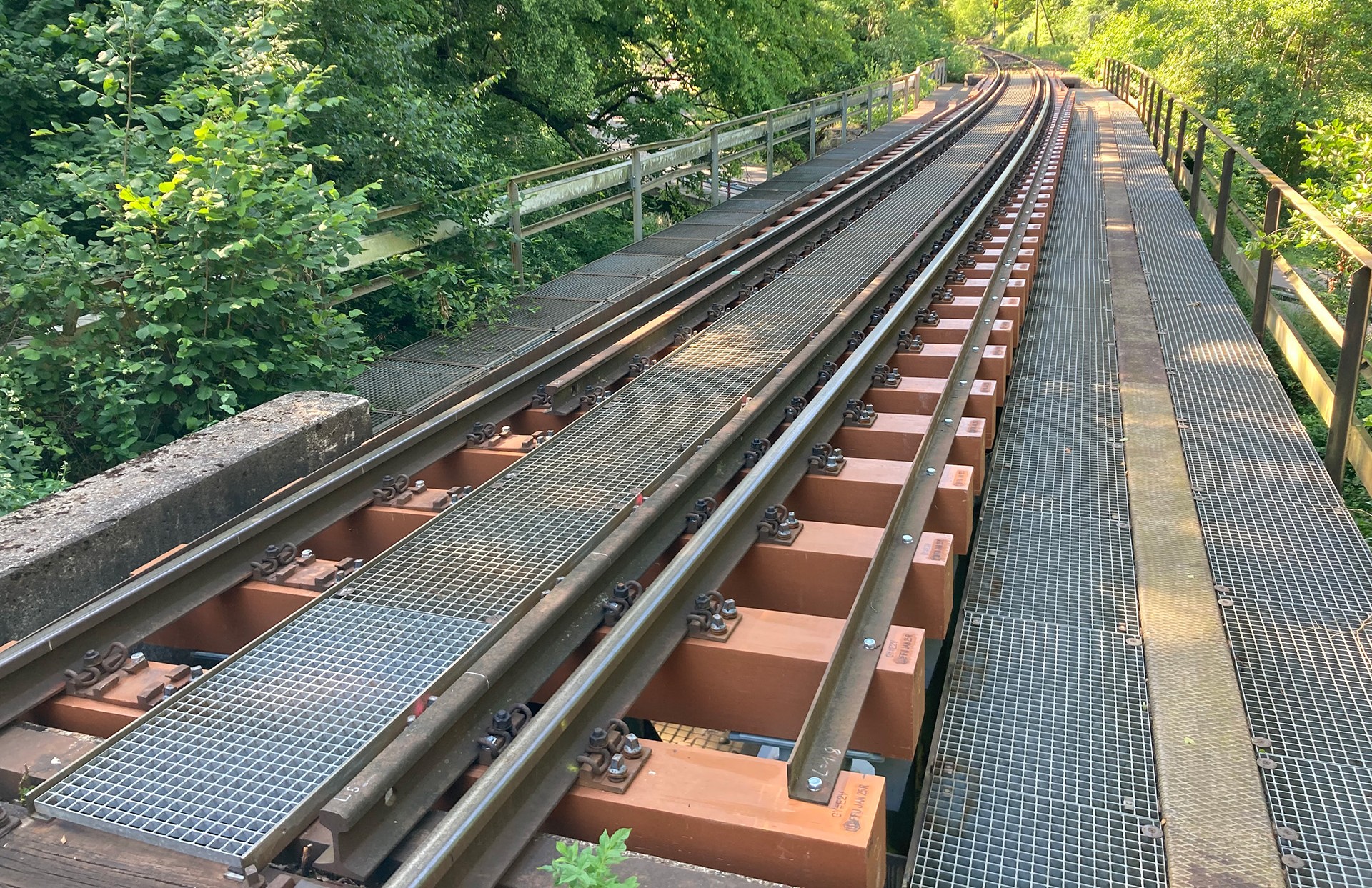 Auf ausgewählten Brücken erfolgte eine Erneuerung der Brückenbalken, wobei anstelle der bisherigen Holz-balken langlebige Kunstholzschwellen mit elastischen Zwischenlagen einge-baut wurden. Ergänzend wurden Kor-rosionsschutzmaßnahmen an Ober-gurten und Auflagerteilen der Brüc-ken durchgeführt, um die Dauerhaf-tigkeit der Bauwerke zu sichern.