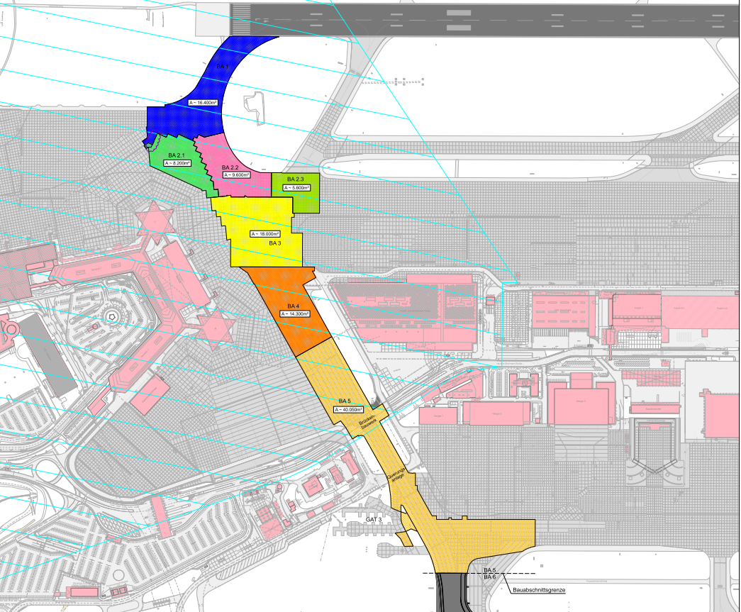 Die Sanierung findet unter laufendem Flugbetrieb statt. Es muss daher sichergestellt werden, dass der lau-fende Betrieb uneingeschränkt mit den vorgegebenen Flugzeugmustern abgewickelt werden kann. Zu diesem Zweck wurden die Sanierungsbe-reiche in fünf Bauabschnitte aufge-teilt. Davon ist Bauabschnitt 2 noch-mals in drei Bauabschnitte unterglie-dert.