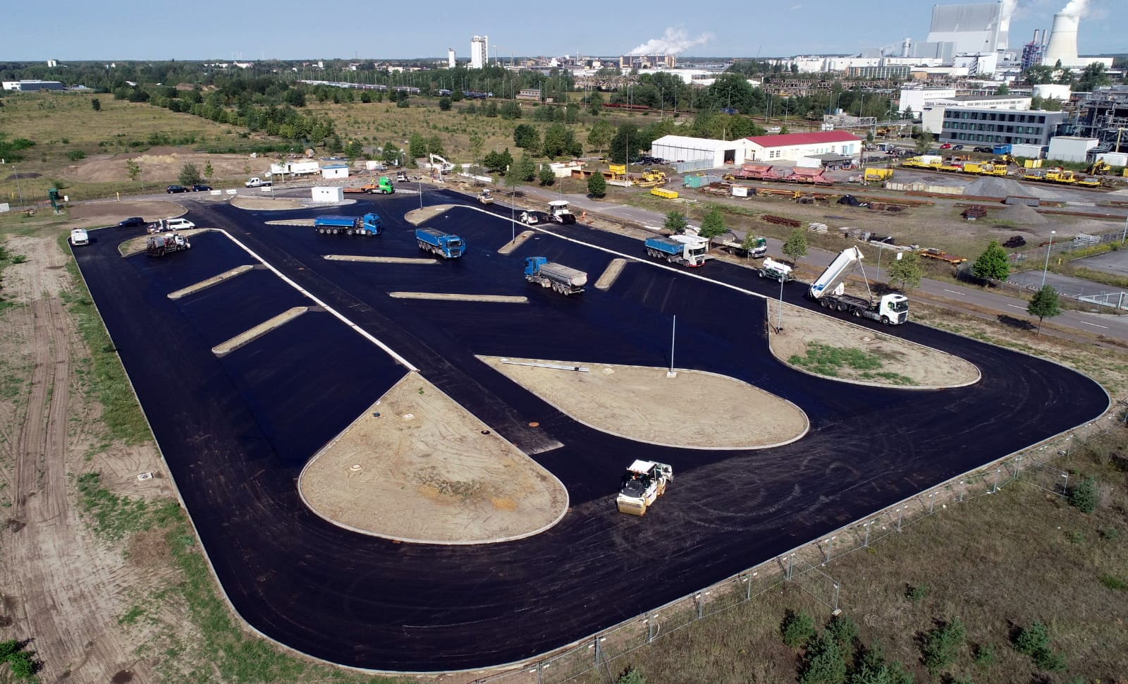 Dieser Parkplatz dient vor allem der Logistik für die Hamburger Container-board in Spremberg. Mit rund 450 Beschäftigten und zwei Papiermaschi-nen ist Spremberg der größte Stand-ort der Hamburger Containerboard-Division mit jährlich etwa 840.000 Tonnen produziertem Papier.
