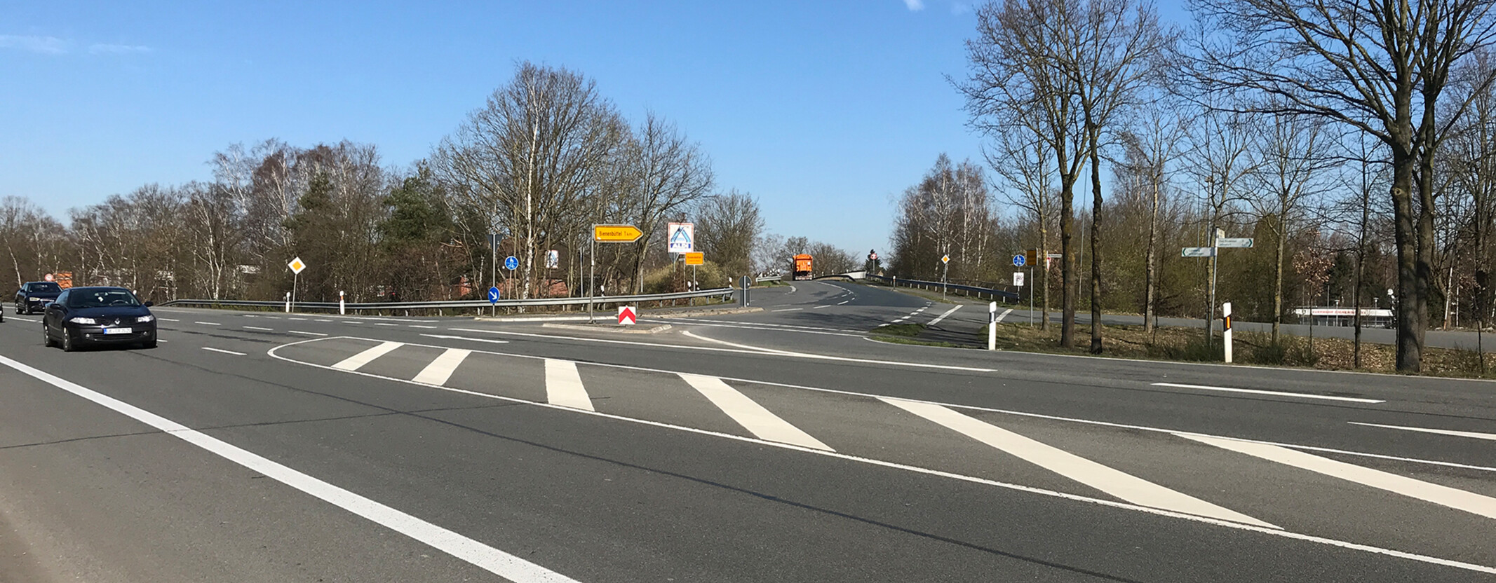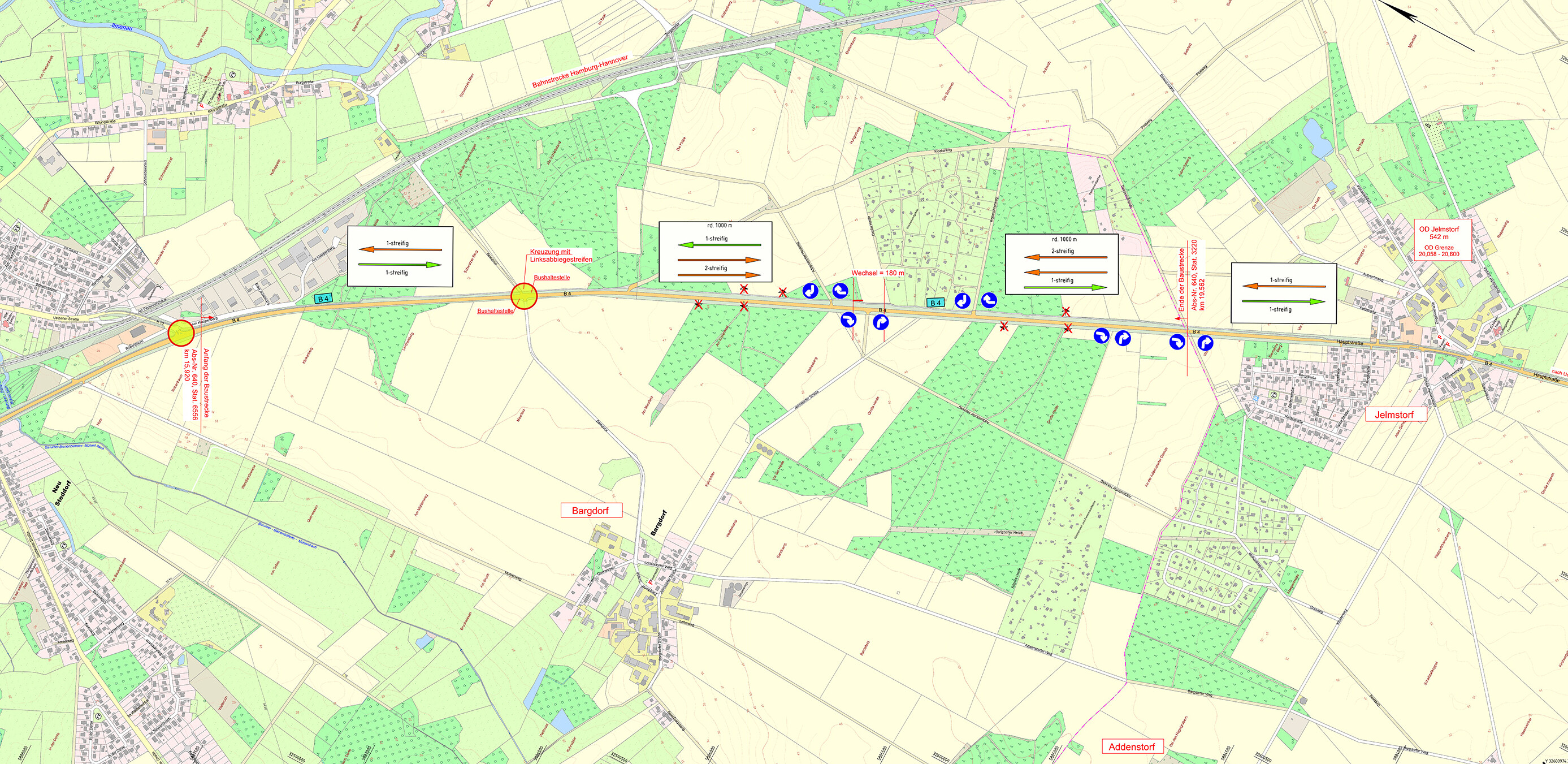 Die stark belastete B 4 Lüneburg-Uel-zen soll zwischen Jelmstorf und Bienenbüttel einer Fahrbahnsanier-ung unterzogen werden. Eine Ver-kehrszählung im Jahr 2015 ergab eine Belastung durch 14.300 Kfz/24 h mit einem SV-Anteil von 2.000 Kfz/24 h. Die derzeitige Markierung der ins-gesamt 11 m breiten Fahrbahn ent-spricht nicht mehr den aktuellen Richtlinien, denn die beidseitigen 1,75 m breiten Mehrzweckstreifen führen zu Unsicherheiten und einer hohen Anzahl von Unfällen, insbe-sondere im Zuge von Überholvor-gängen.