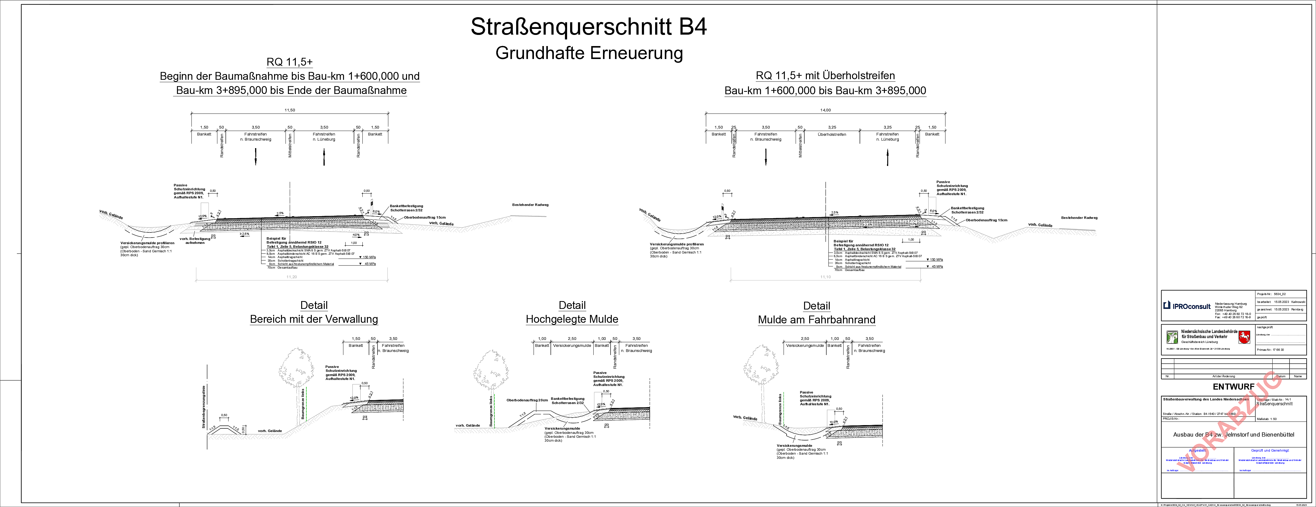 Das größtenteils vorliegende Dach-profil ist in eine Einseitneigung zu verändern und die Entwässerung auf Grundlage heutiger Vorschriftslage anzupassen. Zwei Knotenpunkte sind zu überplanen und die Anbindung eines geplanten Gewerbegebietes zu berücksichtigen.