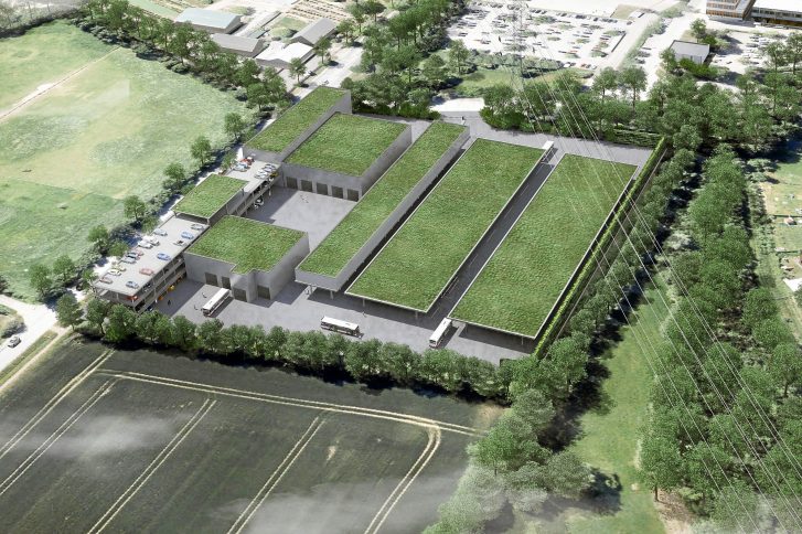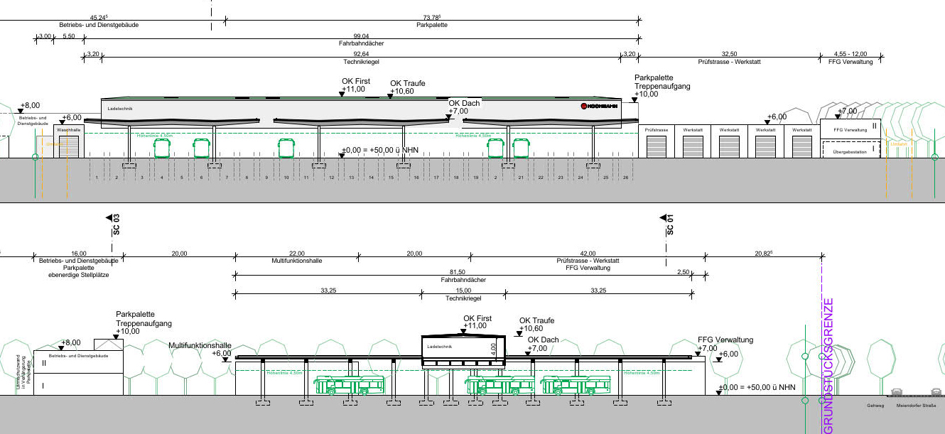 Geplant werden eine überdachte Busabstellung und Ladetechnik, ein Dienstgebäude mit angeschlossener Parkpalette, sowie eine Prüfstraße, Werkstatt-, Wasch- und Wartungs-