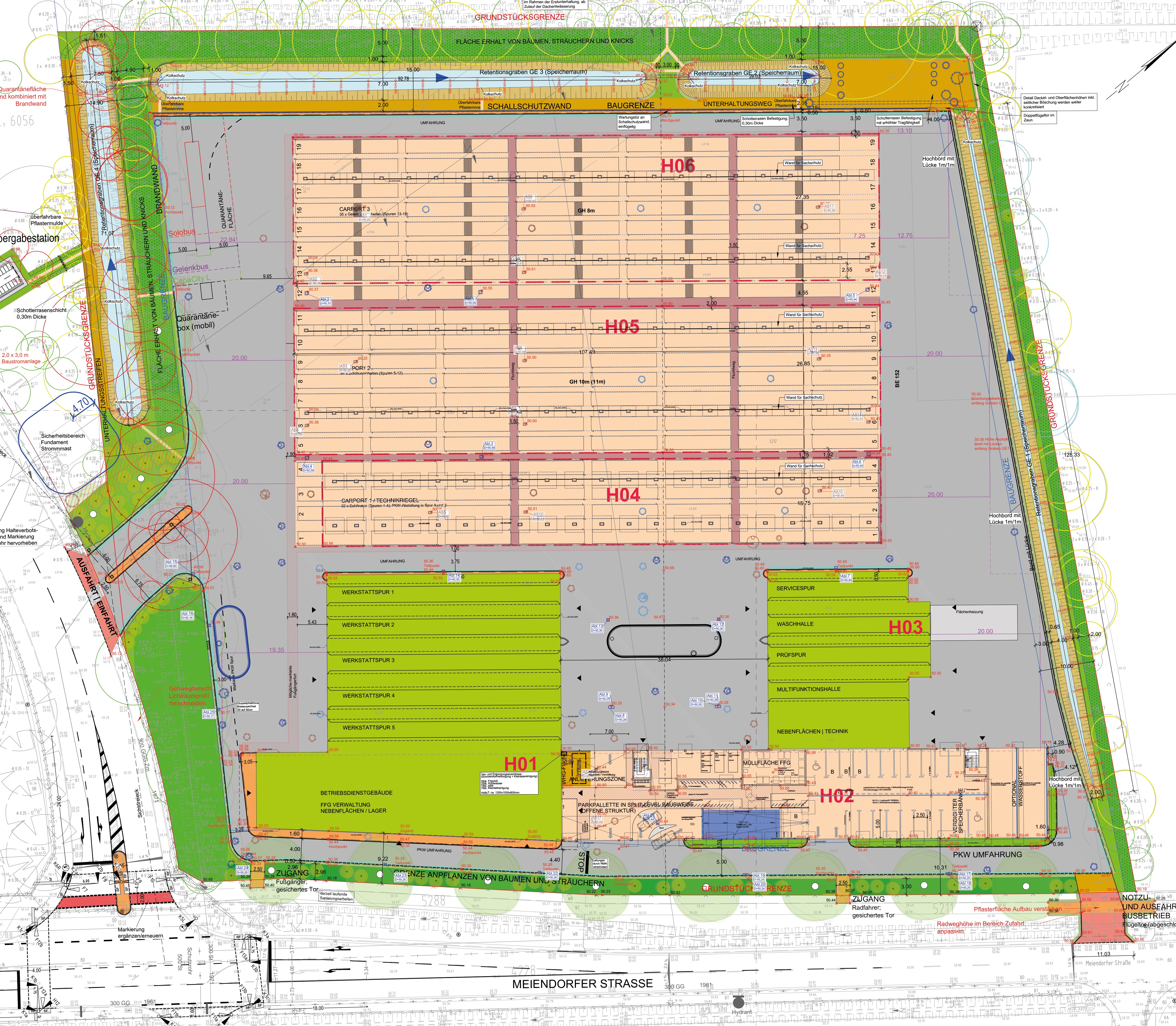 Die Fahrbahndächer dienen als Ver-sorgungsebene und führen die Stromkabel aus dem Technikriegel in die darunter liegenden Abstellstränge und von oben herab zu den einzelnen Bussen. Alle Dachflächen werden mit einer extensiven Begrünung ausgebil-det. In der Planung war zudem die querende Hochspannungsfreileitung 380/110kV zu berücksichtigen. Die Zufahrt erfolgt über die Stichstraße. Der Knotenpunkt wird bedarfsge-recht angepaßt und mit einer Licht-signalanlage ausgestattet.