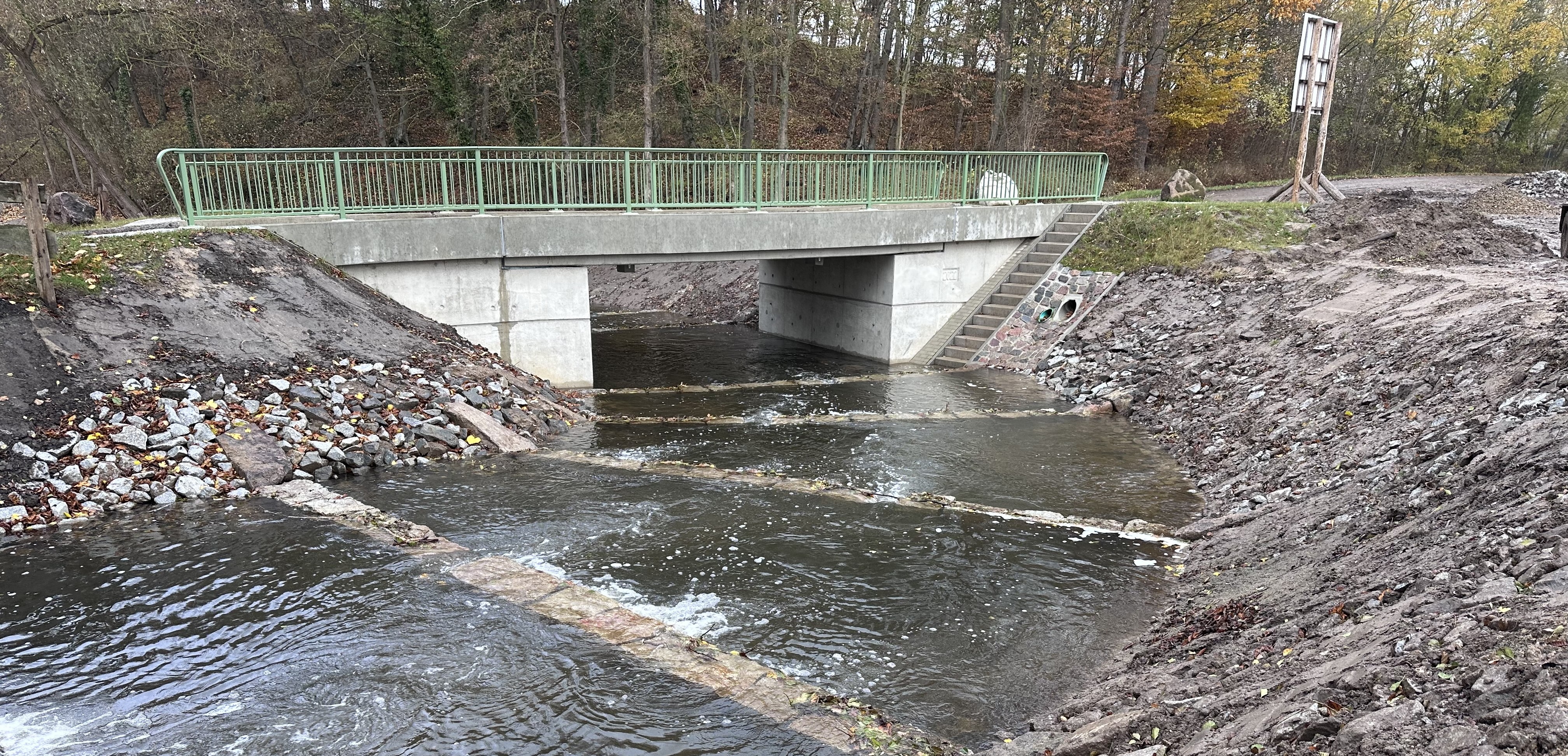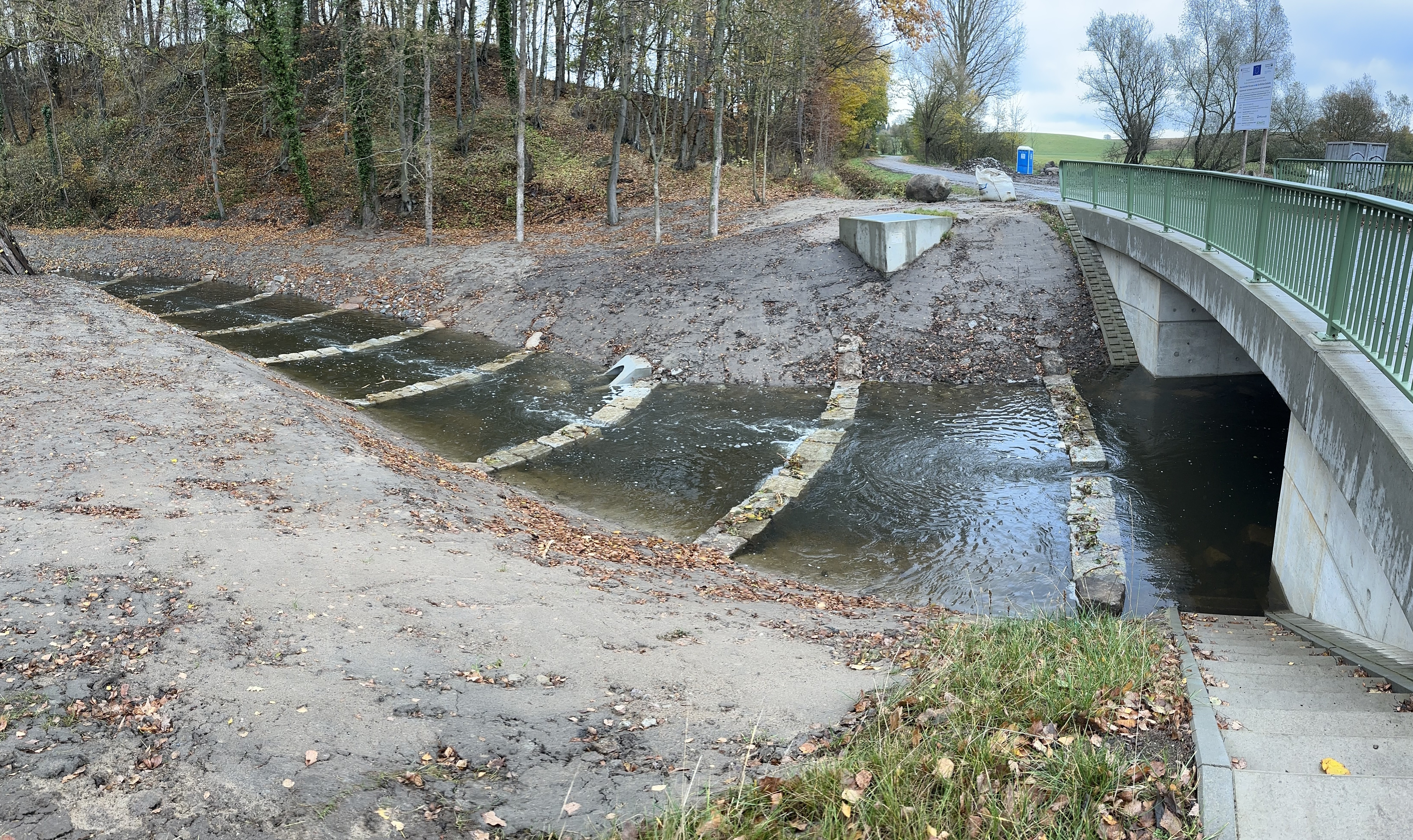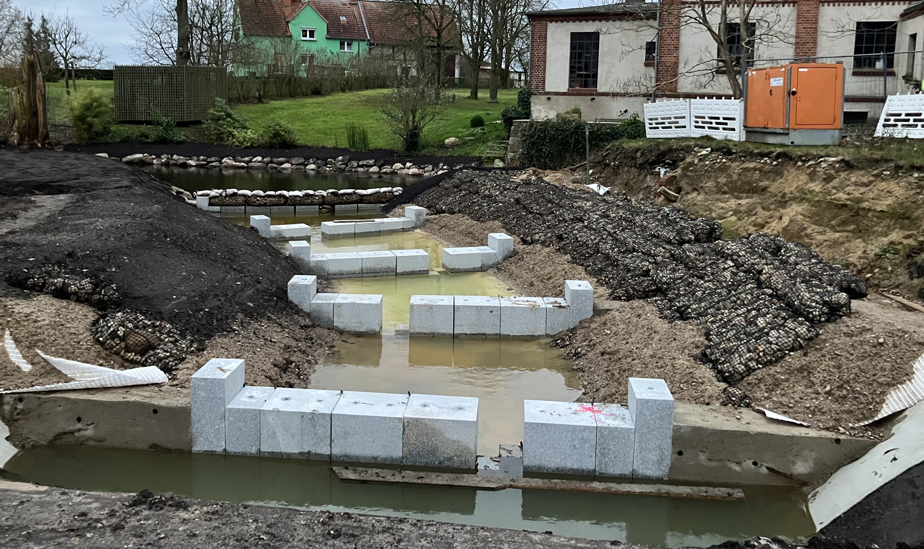 Der Sohlabsturz der ehemaligen Wehranlage im Bereich der Brücke an der alten Leistenower Mühle stellte für Fische und Makrozoobenthos ein Wanderhindernis dar. Daher wurde 2010 eine Fischaufstiegsanlage im alten Bachlauf des Mühlengerinnes errichtet. Diese konnte jedoch nicht die hydraulischen Anforderungen nach DWA-M 509 erfüllen, da durch den starken Geschiebetransport eine hohe Sedimentation in den strö-mungsberuhigten Bereichen des Rau-gerinne-Beckenpasses stattfindet und hier die effektive Mindestwas-sertiefe nicht eingehalten werden kann. Die Ablagerungen mussten regelmäßig vom zuständigen Wasser-