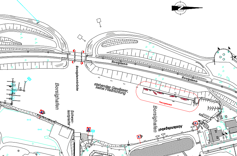 Für die zukünftige Nutzung eines Teil-abschnitts des Borsighafens am Te-geler See ist entlang der linken Ufer-seite die Einrichtung einer rund 90 m langen Anlegestelle für Sport- und Freizeitboote vorgesehen.