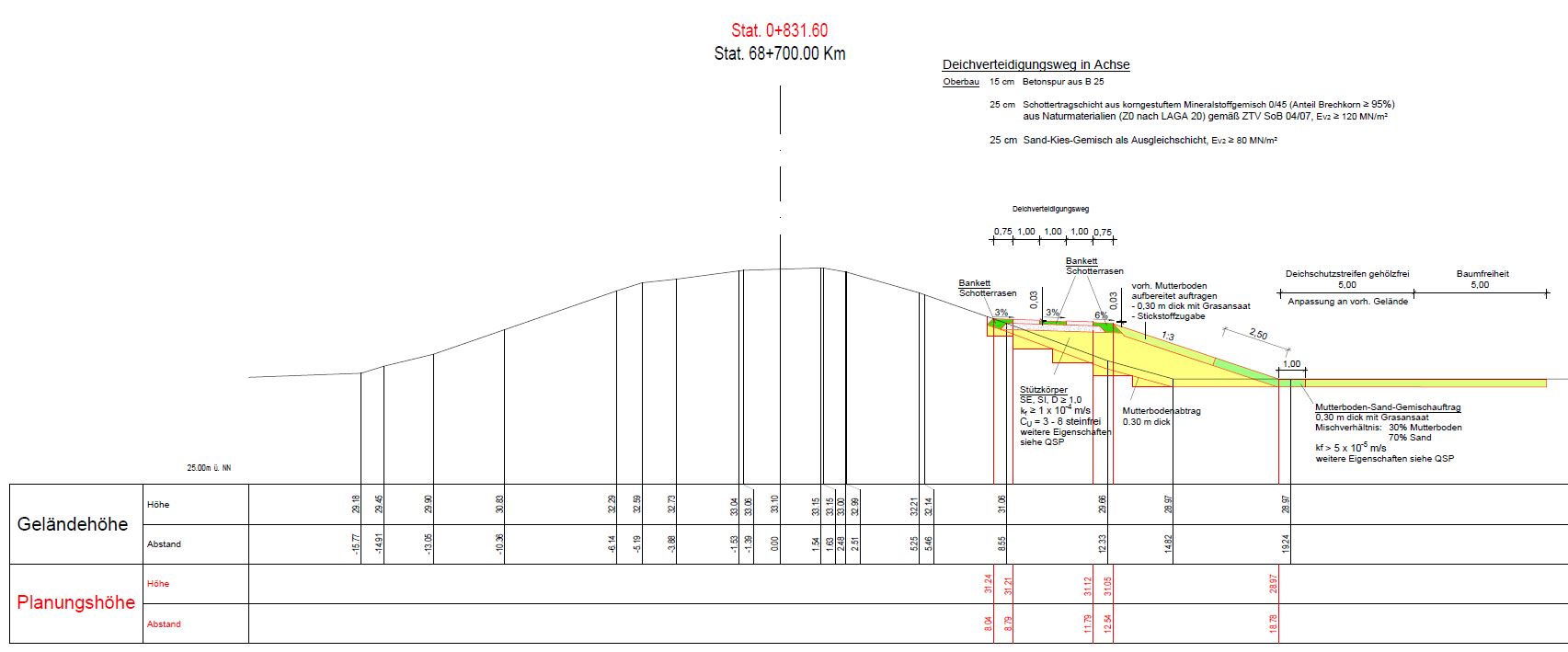 Die vorhandenen rechtsseitigen Hochwasserschutzanlagen zwischen km 67,9 bis 69,35 in Form von Deichanlagen genügten nicht den notwendigen Anfor-derungen für einen ausreichenden Schutz der angrenzenden Ortschaften und Infrastruktur. Die Defizite spiegelten sich in erster Linien darin wieder, dass die Deichkubatur nicht den gültigen Normen entsprach. Ziel der Planung war es die DIN gerechte Sanierung des 1.450 m langen Deichabschnittes. Nach DIN 19712 war eine befahrbare landseitige Berme mit Deich-verteidigungsweg vorzusehen. Dieser war mit drei Ausweichstellen alle 400 m zu versehen.