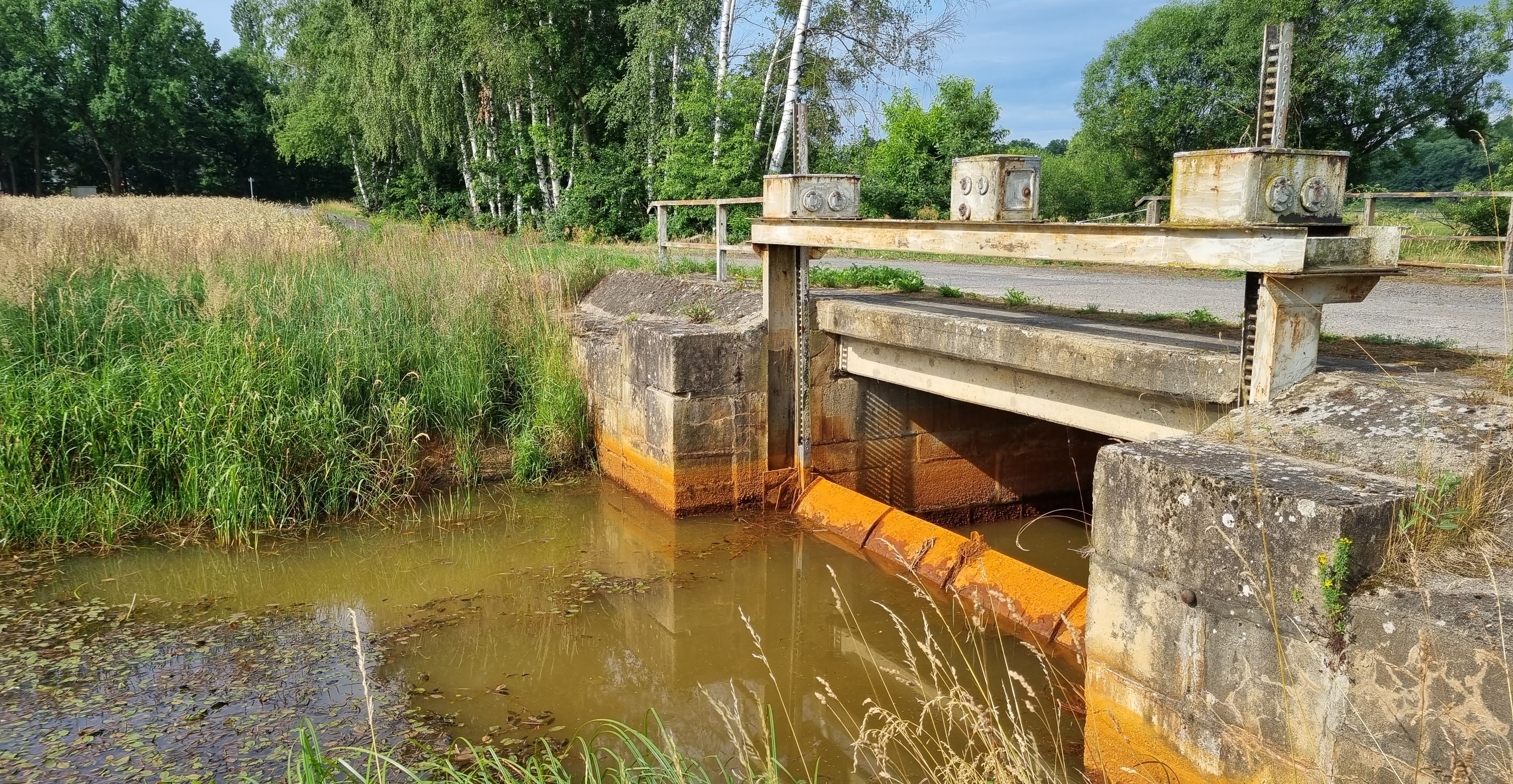 Im Biehlener Binnengraben (Gemar-kung Ruhland) befinden sich die zwei Wehrbauwerke 18.01 (in ein Brücken-bauwerk integriert) und 18.09.