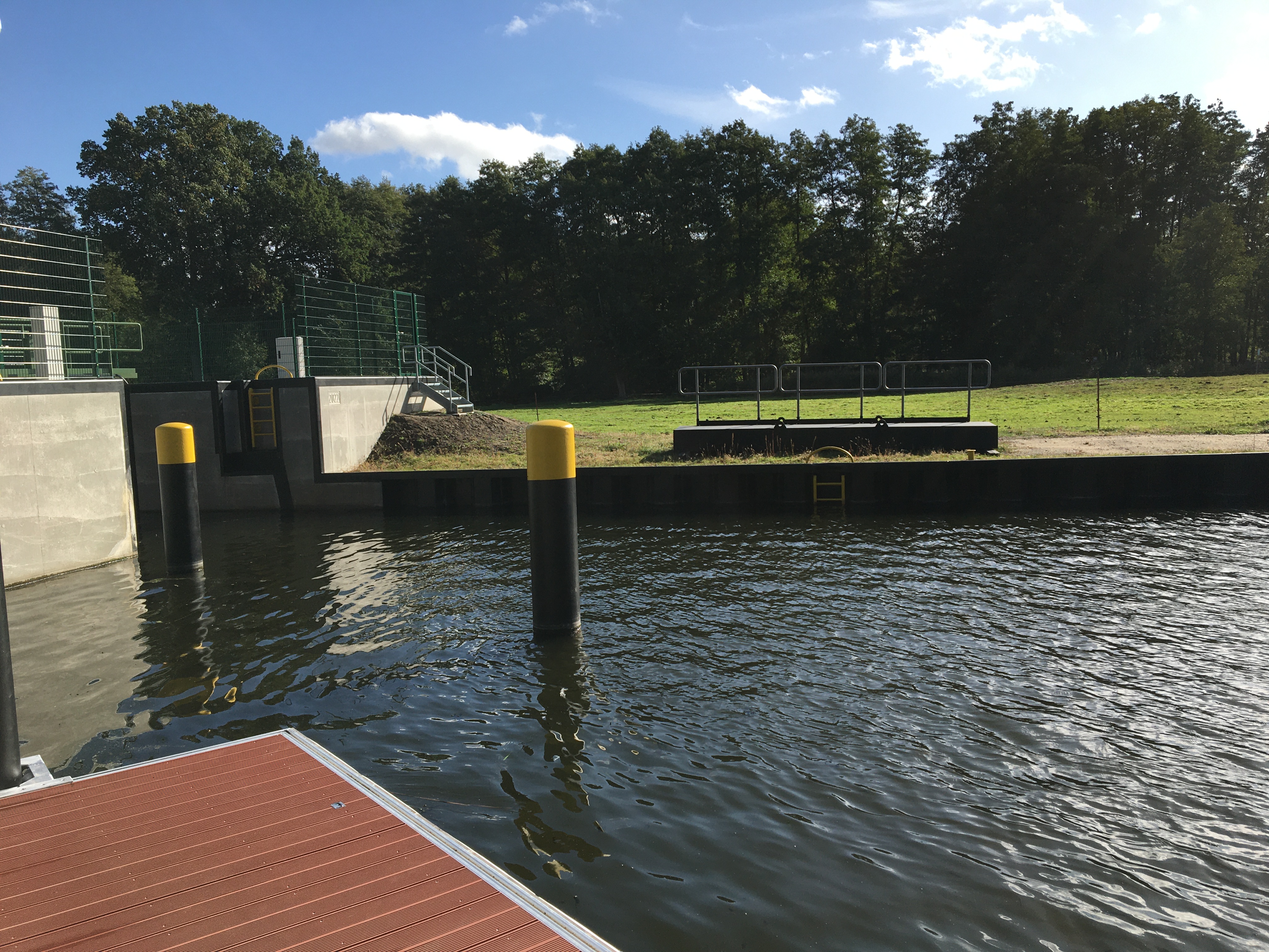 Der Ersatzneubau wurde als Spund-wandschleuse mit massive Schleu-senhäuptern in der bestehenden Lage mit folgenden nutzbaren Ab-messungen ausgeführt: