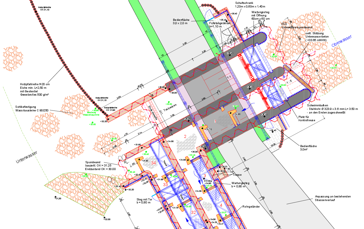 heit, Verkehrssicherheit und Dauer-haftigkeit sind nur noch mit starken Einschränkungen gegeben, so dass ein Ersatzneubau dringend erforder-lich ist. Durch die am Bauwerk fest-gestellten Schäden und Mängel (Betonteile und Schütztafel) wird das Bauwerk mit der Bauwerksnote 3,5-4 eingestuft.