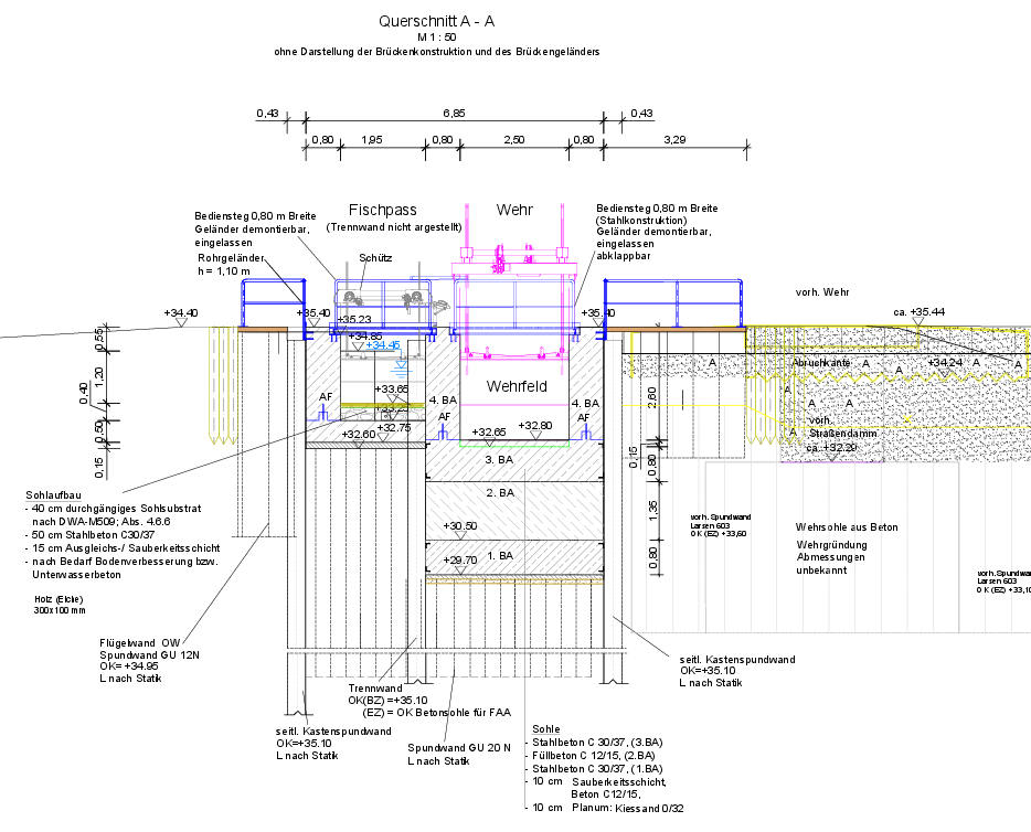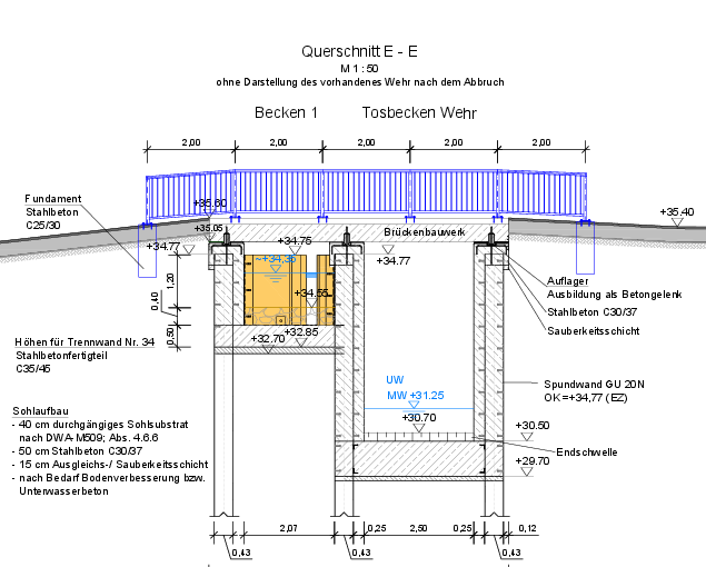 Das mit einer Brücke kombinierte Wehr wurde im Prüfbericht als Plat-tenbrücke eingestuft und der Zustand des Wehr-/Brückenbauwerkes als "ungenügend" bewertet. Standsicher-