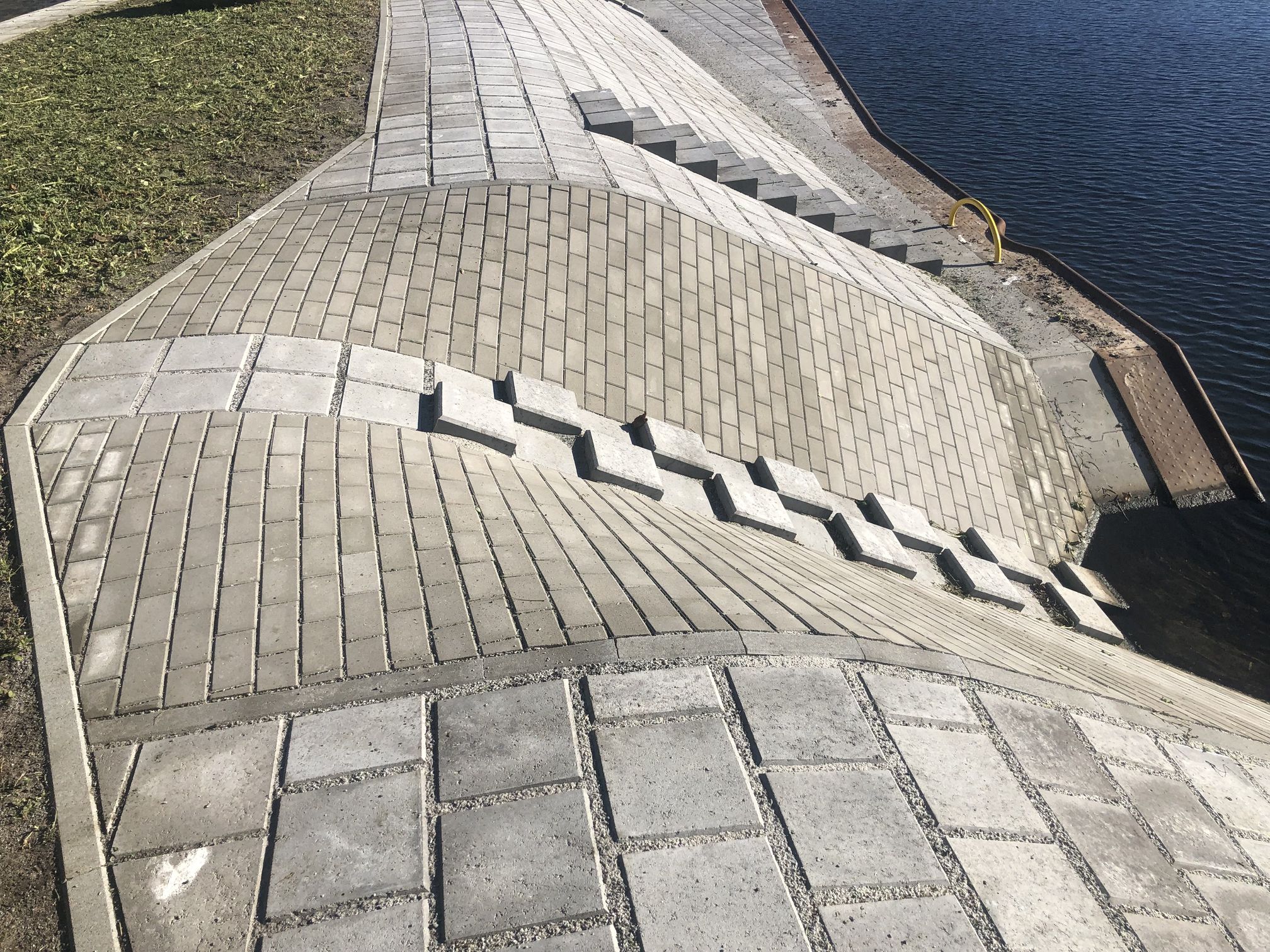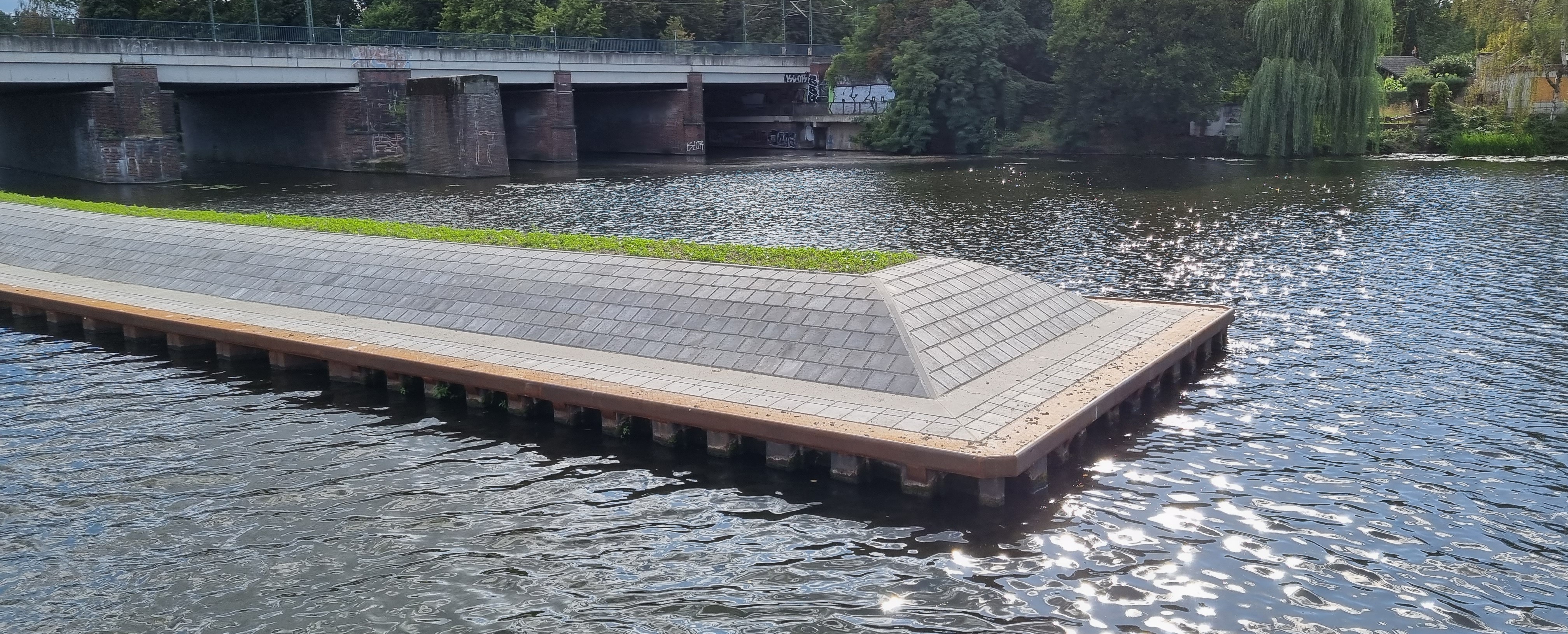 Der an die Bahnbrücke angrenzende Trenndamm wurde mittels eines ver-ankerten Spundwandkastens mit einer Böschung und anschließender Pflasterfläche bis zum Brückenpfeiler erneuert.