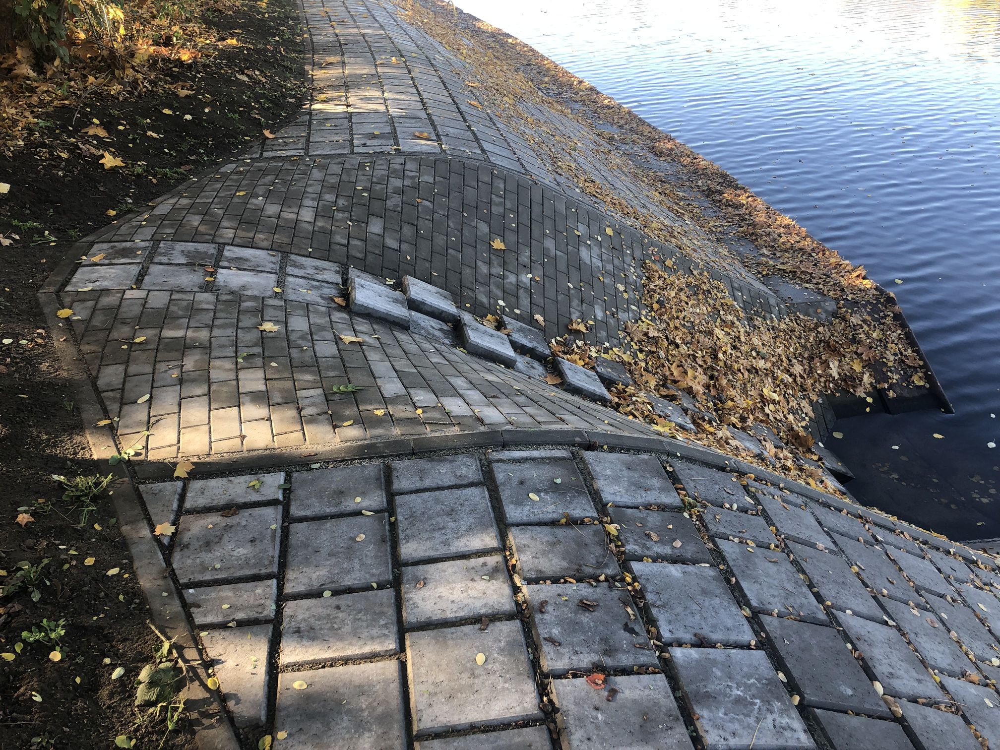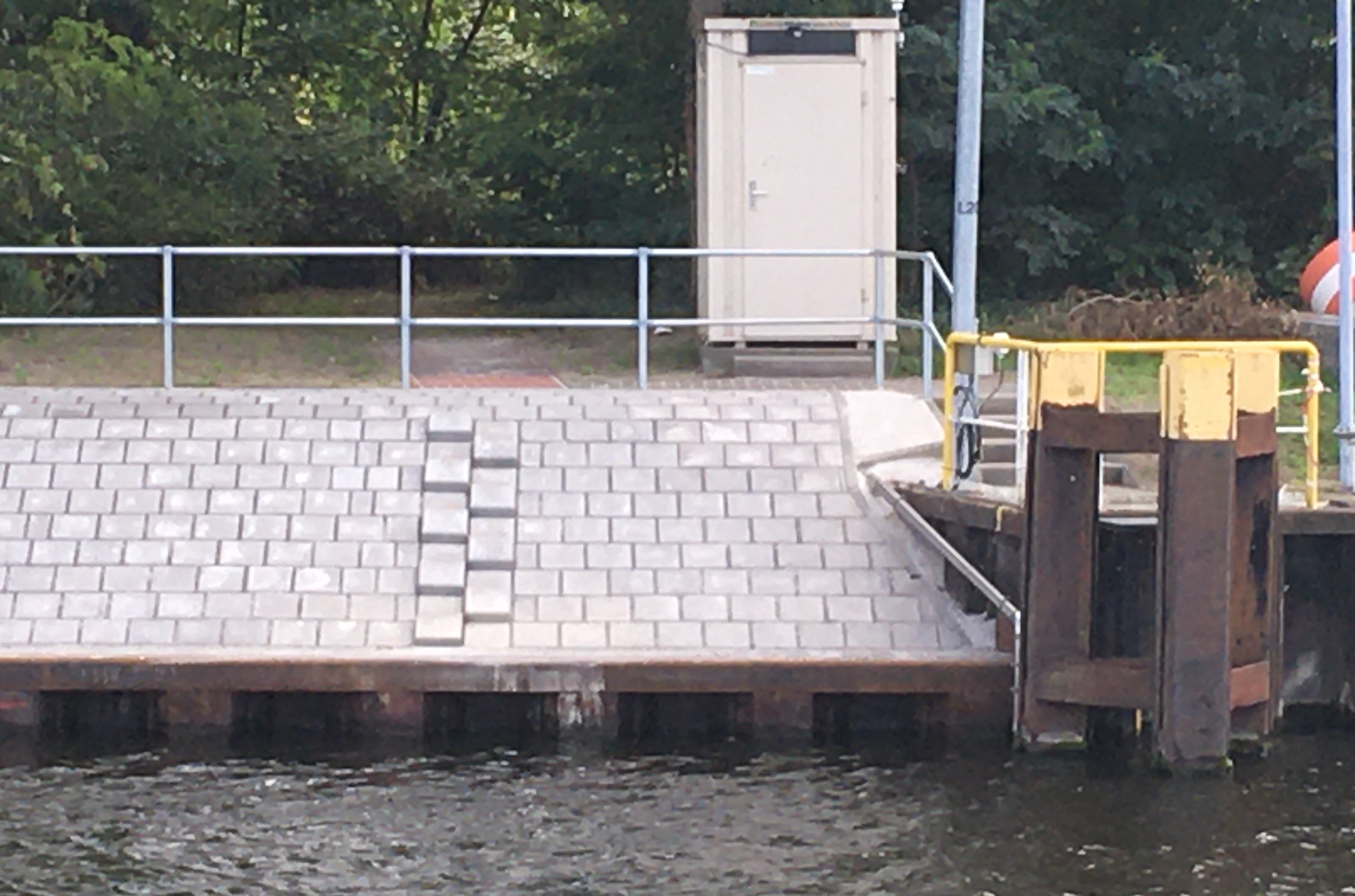 eine Spundwand aus Stahlspund-bohlen als Fußsicherung und einem oberhalb anschließenden Deckwerk aus Betonpflastersteinen mit einem Unterbau aus Beton.
