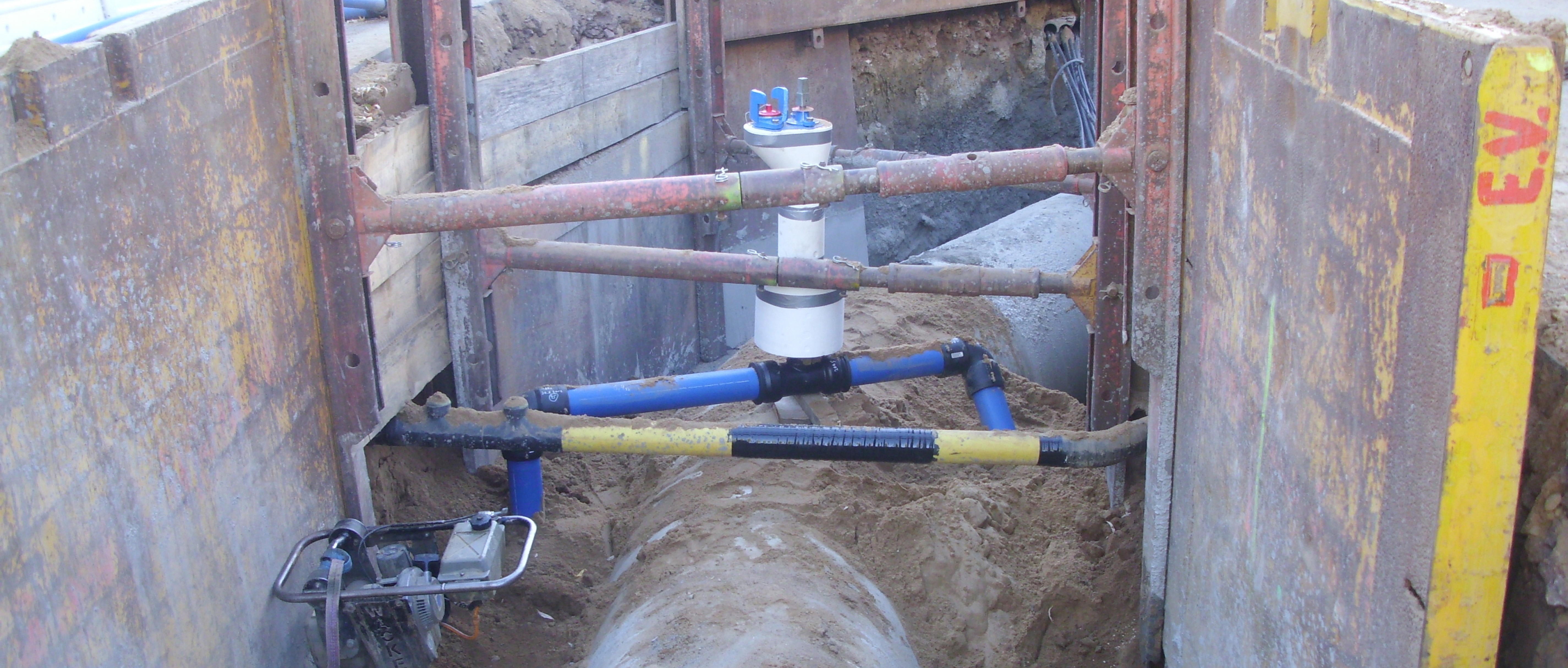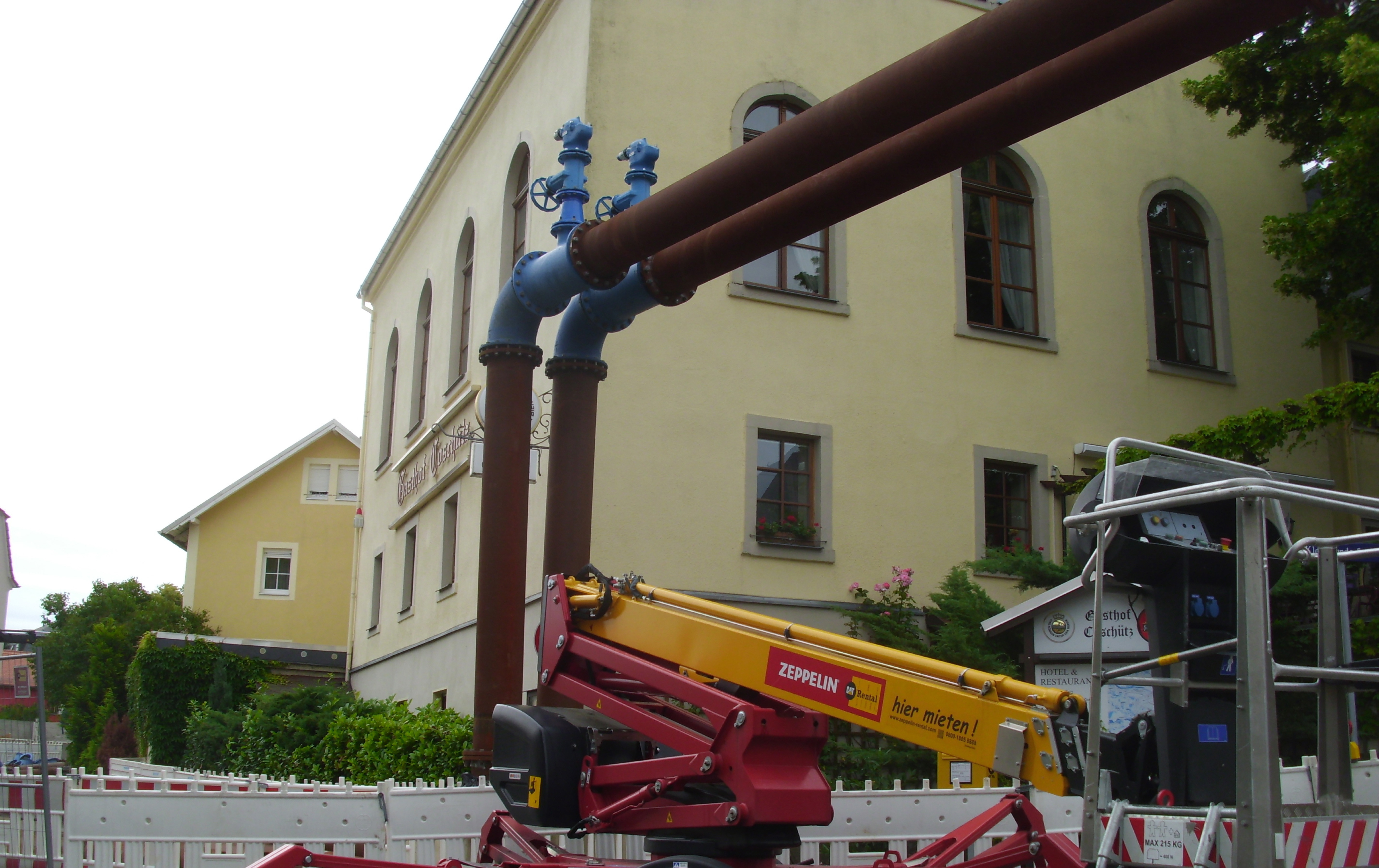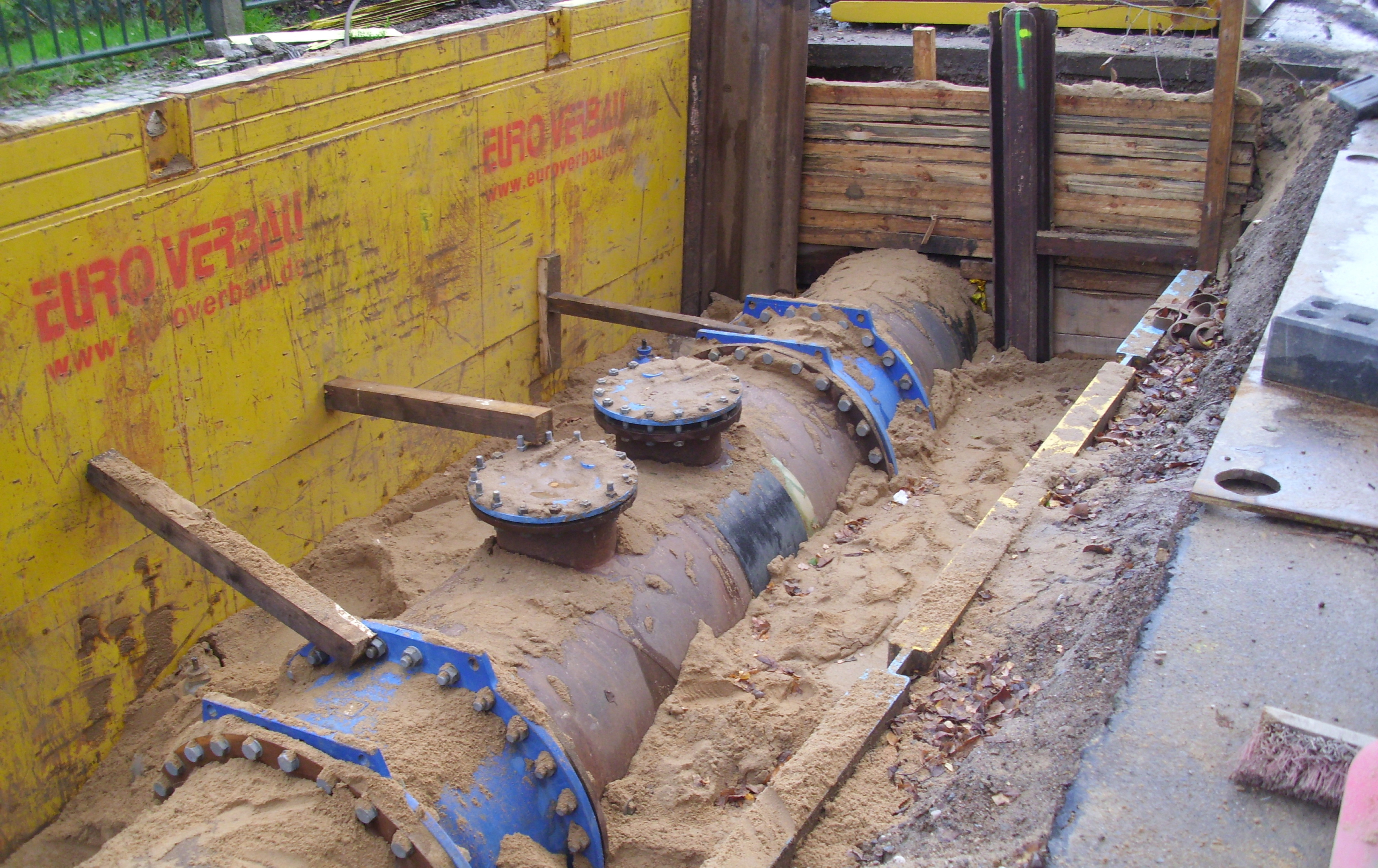 Zur Aufrechterhaltung des Betriebes des Wasserwerkes und der Wasser-versorgung musste eine Notver-sorgung mittels Bypassleitung 2 x DN 400 (Qmin > 1.800 m³ / h) aufgebaut und betrieben werden.