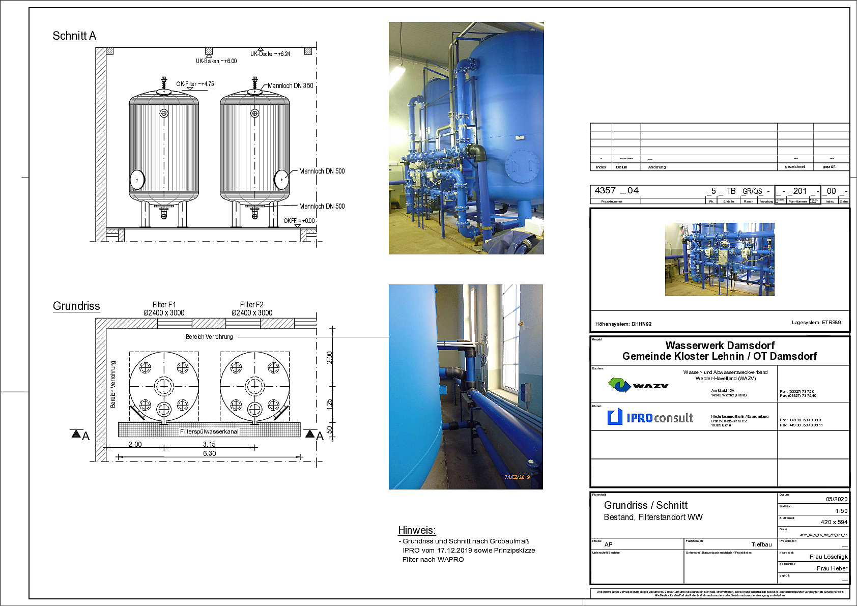 IPROconsult, Niederlassung Berlin/ Brandenburg wurde vom Wasser-und Abwasserzweckverband Werder-Ha-velland (WAZV) mit der Sanierung der Filter 1 und 2 sowie dem Austausch der Brunnenstube Br. 6/1983 im Was-serwerk (WW) Damsdorf beauftragt.