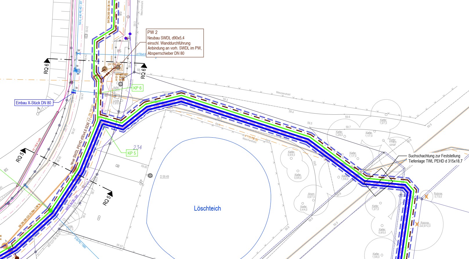 - 2 Trinkwassertransportleitungen PEHD d315 x 18,7 SDR 17 über eine Gesamtlänge ca. von 2.100 m