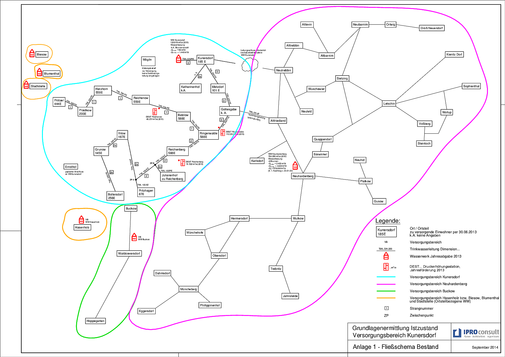 IPROconsult, Niederlassung Berlin/ Brandenburg wurde von der Wasser- und Abwasserentsorgungsgesell-schaft Märkische Schweiz mbH 2014 mit einer Studie zur Erfassung des Ist-zustandes des Versorgungsbereiches Kunersdorf beauftragt als Vorausset-zung für die Entscheidungsfindung der WAMS, wie die Wasserversorgung der Anlieger des Verbandes aufrecht erhalten werden soll.