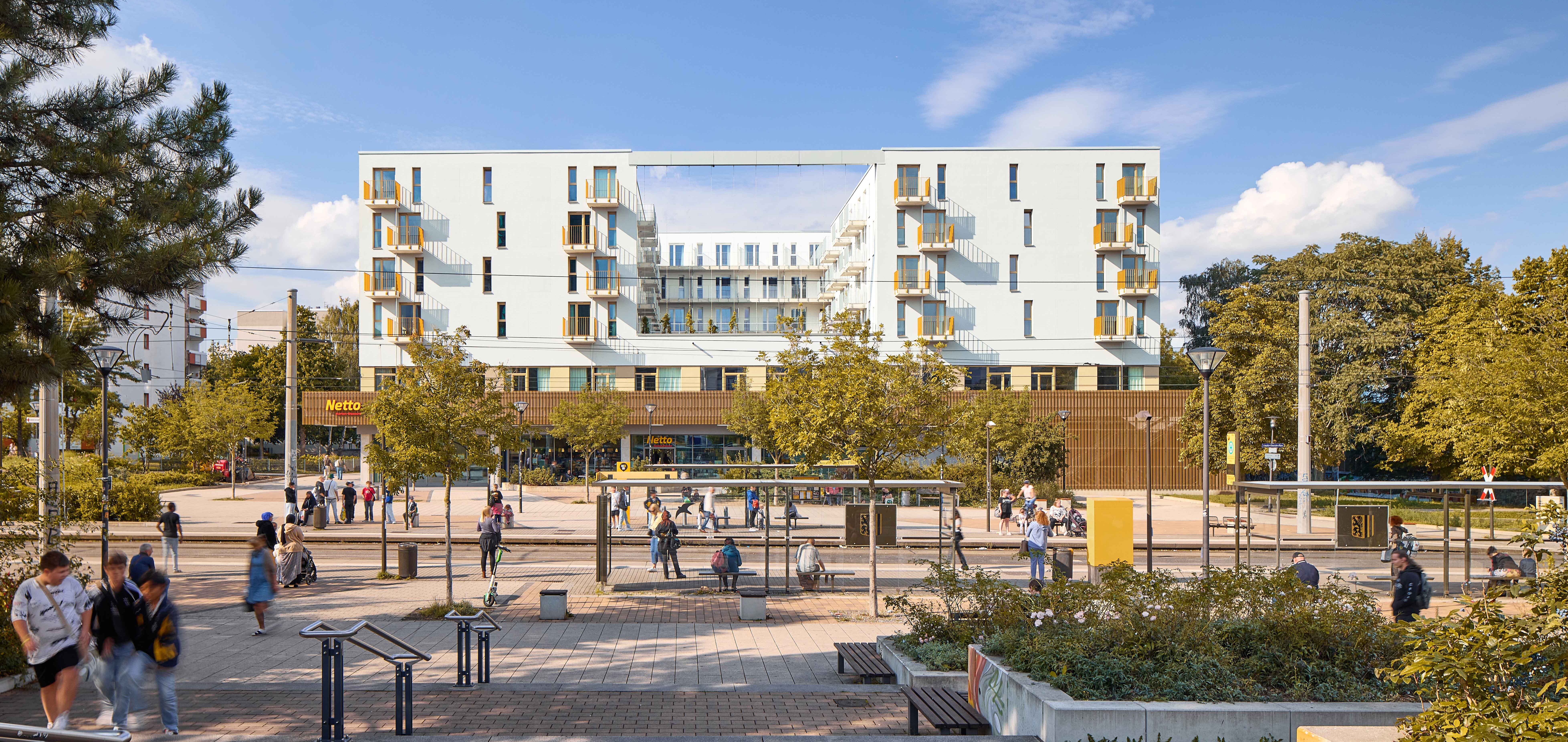 Der markante Neubau bildet den Auf-takt der Höhenpromenade in Dresden-Gorbitz, einer städtebaulich bedeut-samen, präsenten Stelle. Höhen-technisch orientiert sich das Gebäude an der Umgebung.