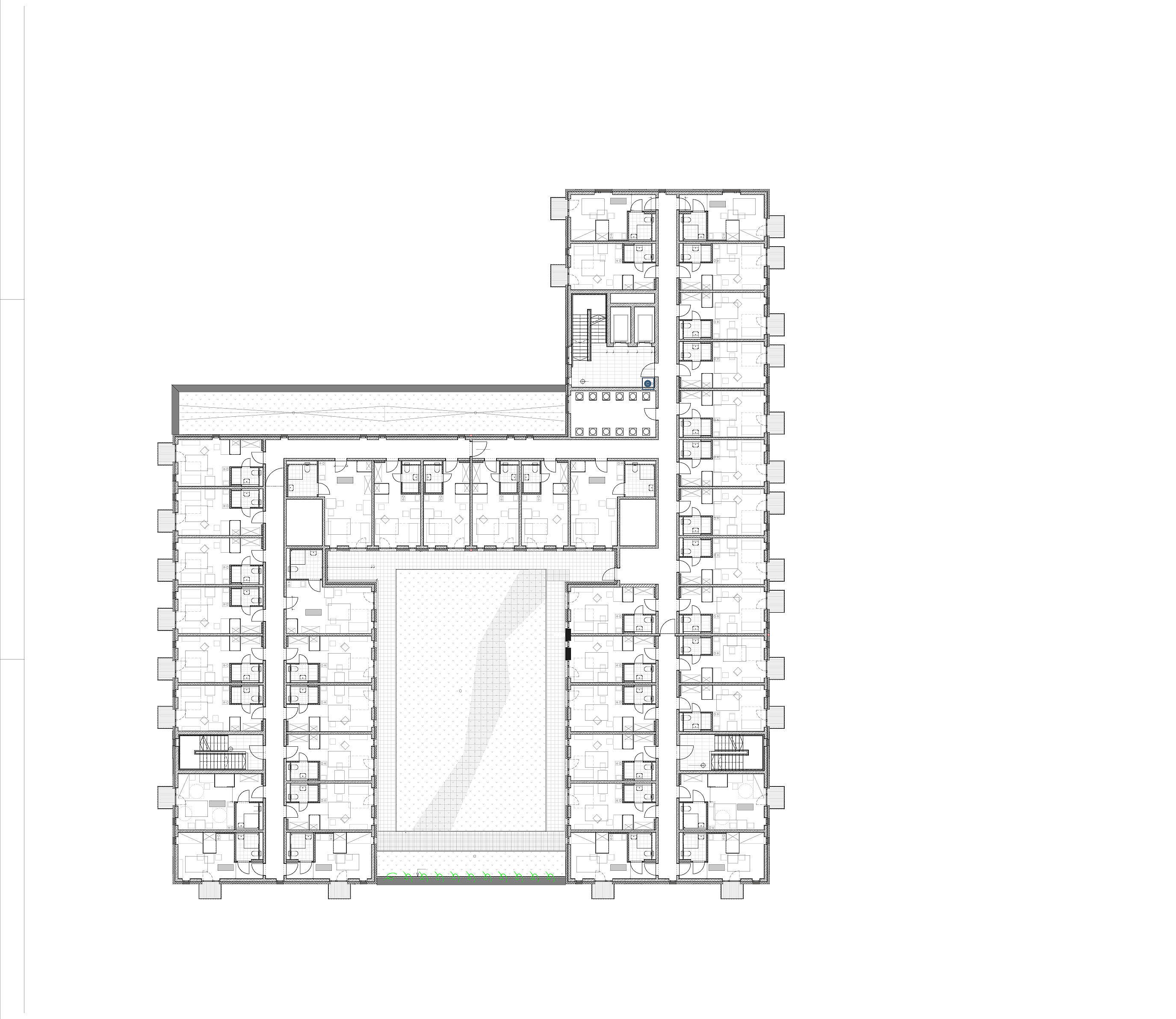 Das Erdgeschoß wird durch Einzel-handel genutzt, das 1. Obergeshoß beherbert ein Fitnesscenter kombi-niert mit Appartments. Die Oberge-schosse zwei bis fünf beherbergen Appartements.