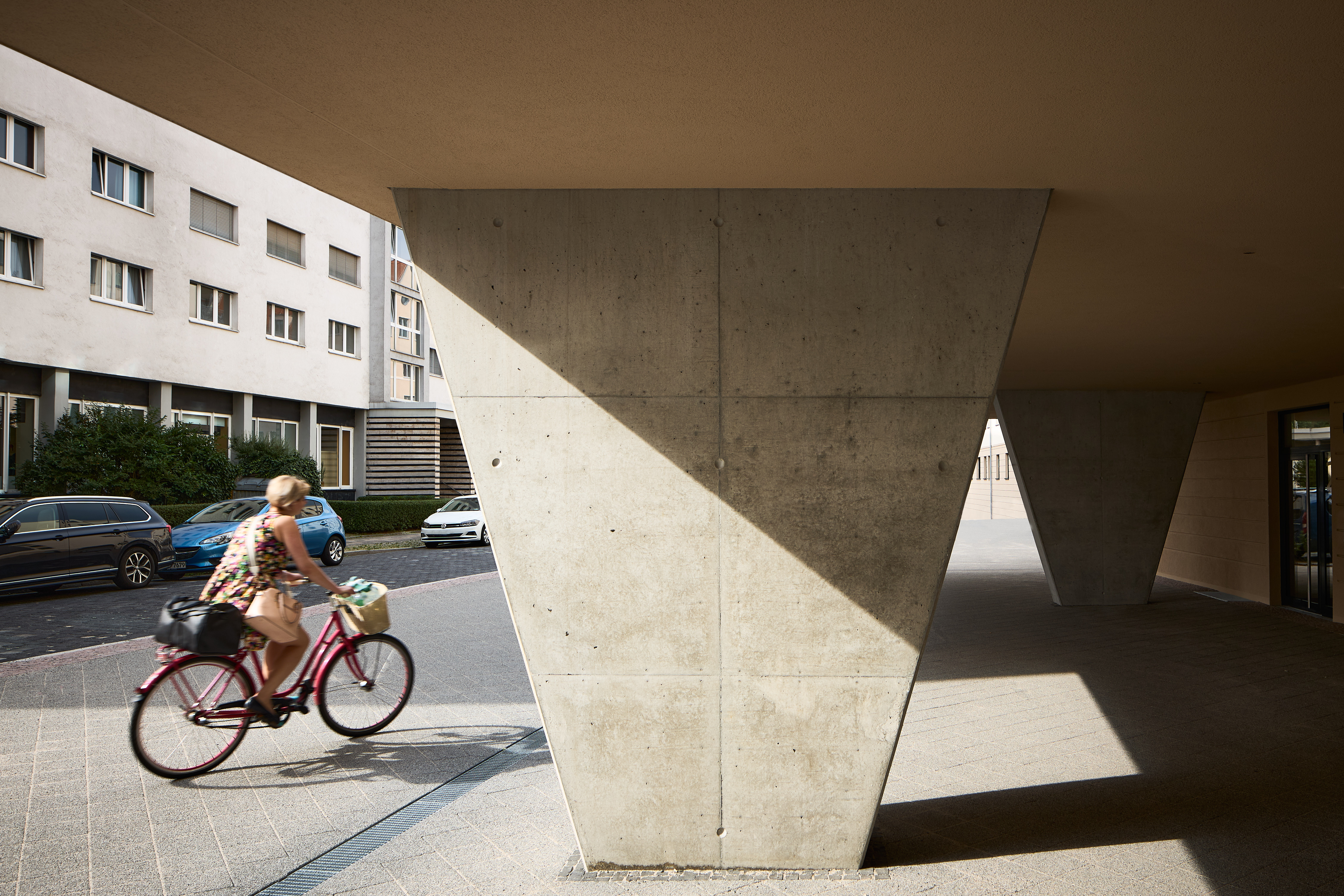 zurück und eröffnet einen Quar-tiersplatz, der neben Sitz- und Aufent-haltsmöglichkeiten von einem kleinen Café bespielt werden kann und somit nicht nur als Zentrum des Neubaus fungiert, sondern auch das nähere Umfeld zum Austausch einlädt. Fahrräder und Kinderwagen können wettergeschützt in leichten, halbhoch begrenzten Bereichen in den Trep-penhäusern neben den Durchgängen von Straßen- zu Grünraum unter-gestellt werden. Das neue Haus bietet 152 Wohnungen mit ein bis vier Zimmern. Neben dem Gewerbe an der Querstraße werden 45 Einzimmer-wohnungen, 45 Zweizimmerwohn-ungen, 36 Dreizimmerwohnungen und 26 Vierzimmerwohnungen angebo-ten. Alle Wohnungen verfügen über eine Loggia und Wohnraum mit optionaler offener Küche als zentralen Raum.